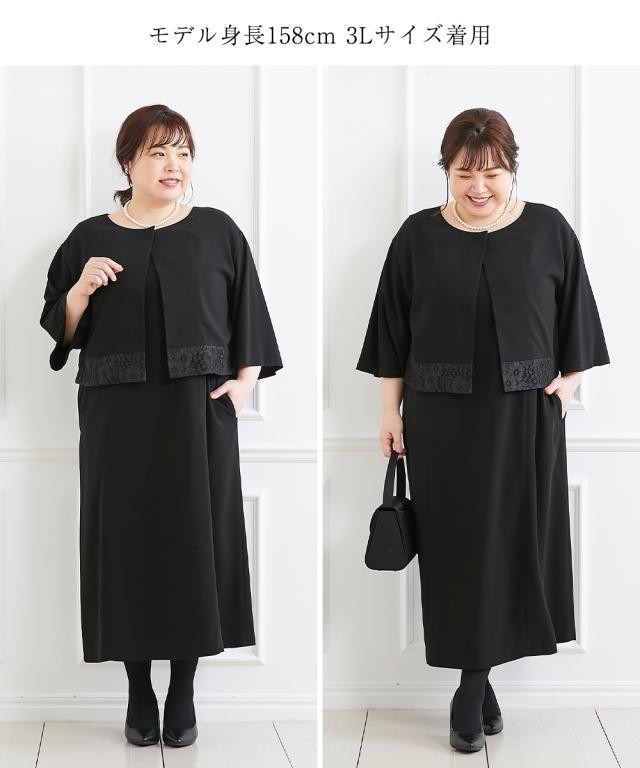 【喪服・礼服】洗える防しわ前開き裾レースアンサンブル風ワンピース<大きいサイズ有>