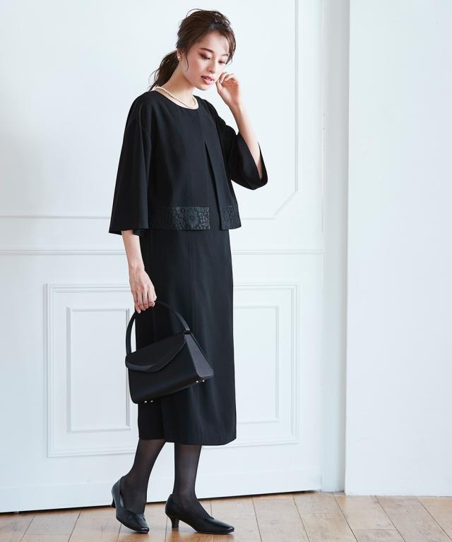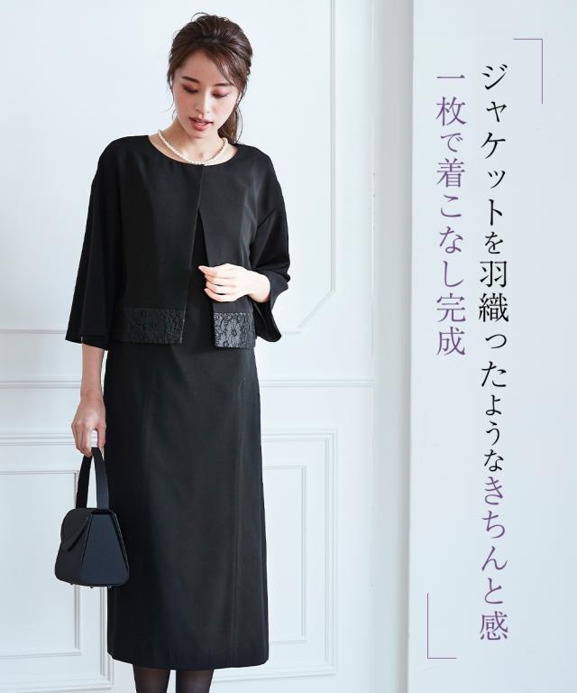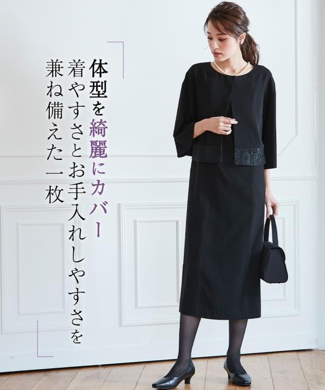品のある格式高い装いを大切にする方へ礼節に沿った気品のある姿を叶えてくれる王道ブラックフォーマル こだわりポイント一枚できちんと見え!涼やかアンサンブル風ワンピース裾にレースをあしらった上品な大人の印象を演出してくれます前開き仕様なので、着脱楽チン。お化粧崩れもカバーしてくれます上身頃部分に接触冷感清涼裏地を使用。夏場も涼やかなに着用頂けます防しわなので、しわになりにくい洗濯機(ネット使用)で洗えるので、お手入れ楽チン!ご家庭でお手入れができます喪服としてだけでなく、結婚式・参観日・卒業式などすべてのフォ
