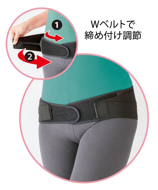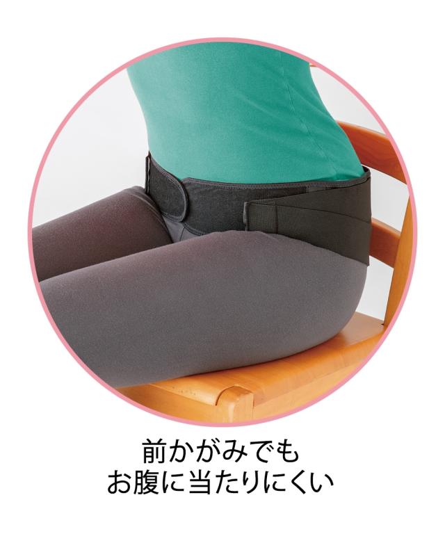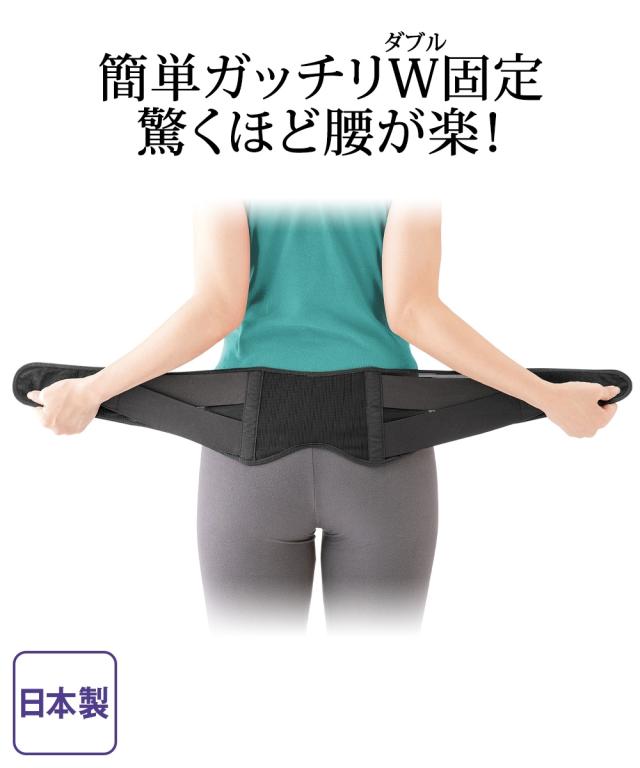 簡単ガッチリWダブル固定。驚くほど腰が楽!前かがみでもお腹に当たりにくい!2つのソフトボーンで腰を支え、ベルトがメッシュ仕様でムレにくい。ワンタッチテープで着脱簡単。