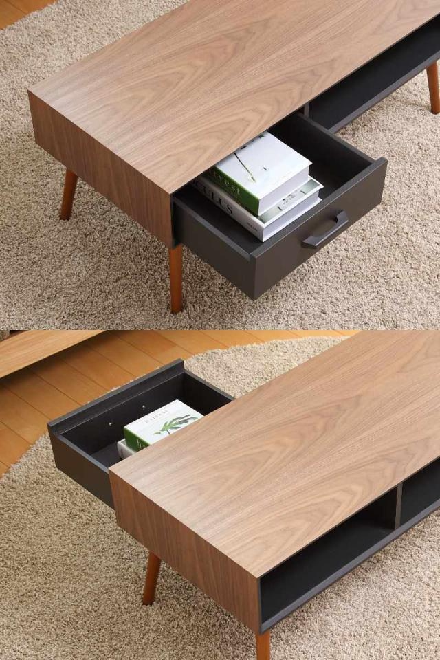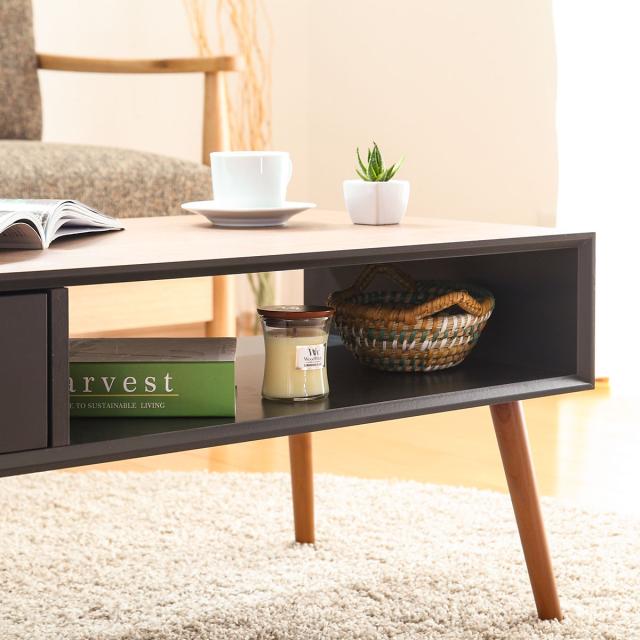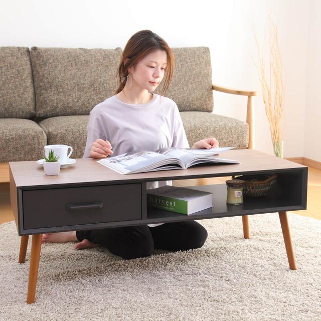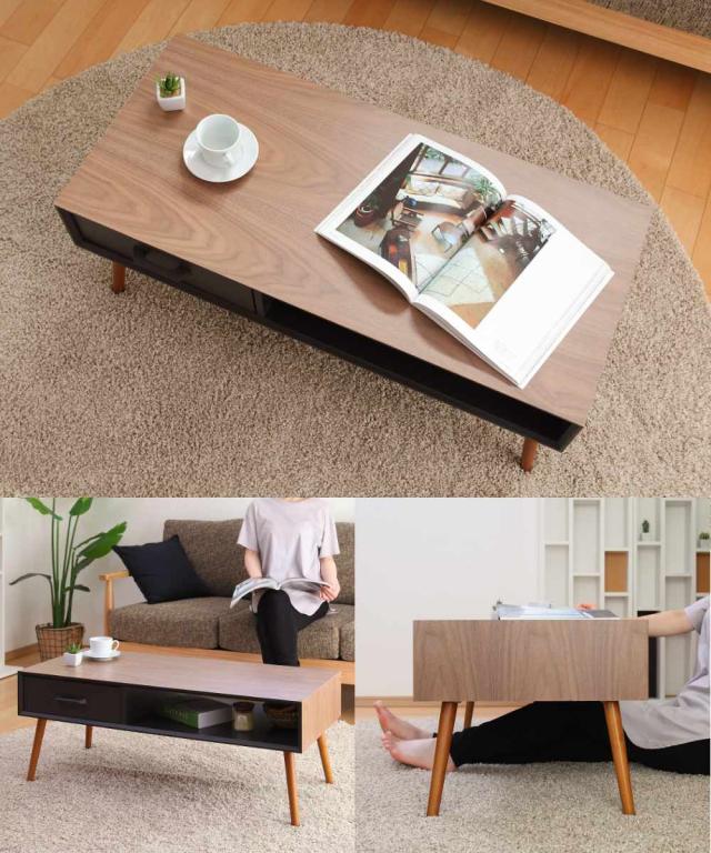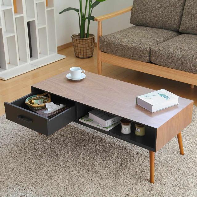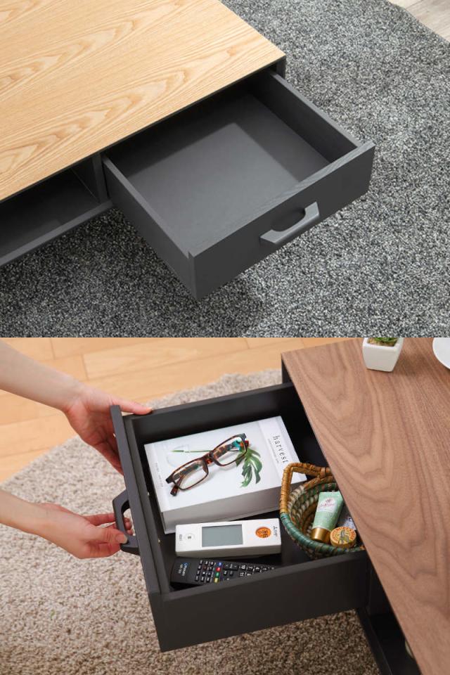 木目が映えるモダンなデザインの引出し付きセンターテーブル