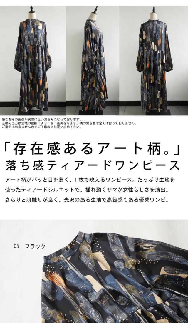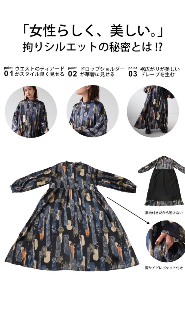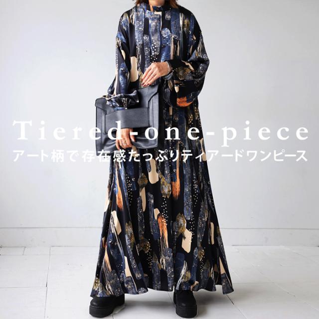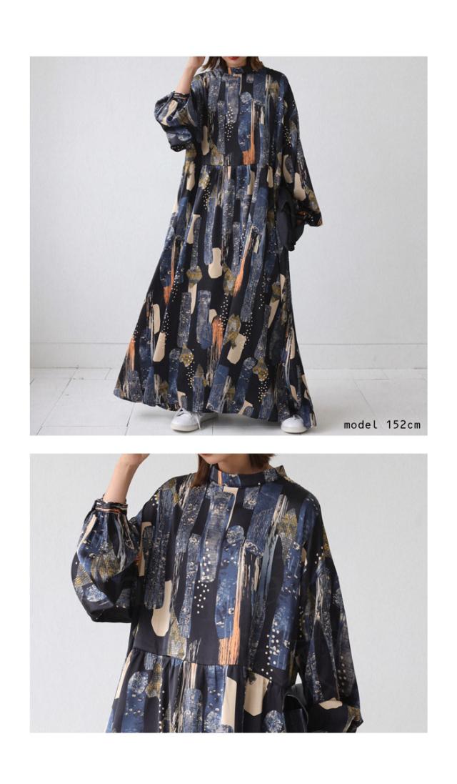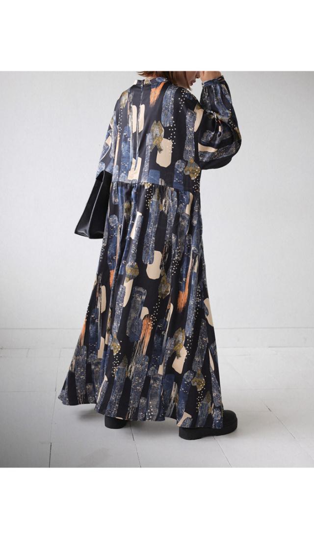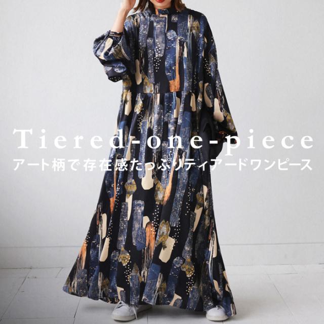 pk-00891 長袖 柄ワンピ 柄 アート ティアード ウエスト切替え ゆったり マキシ丈 Aライン スタンドネック バックファスナー 総柄 大きいサイズ 裏地付き きれいめ オケージョン