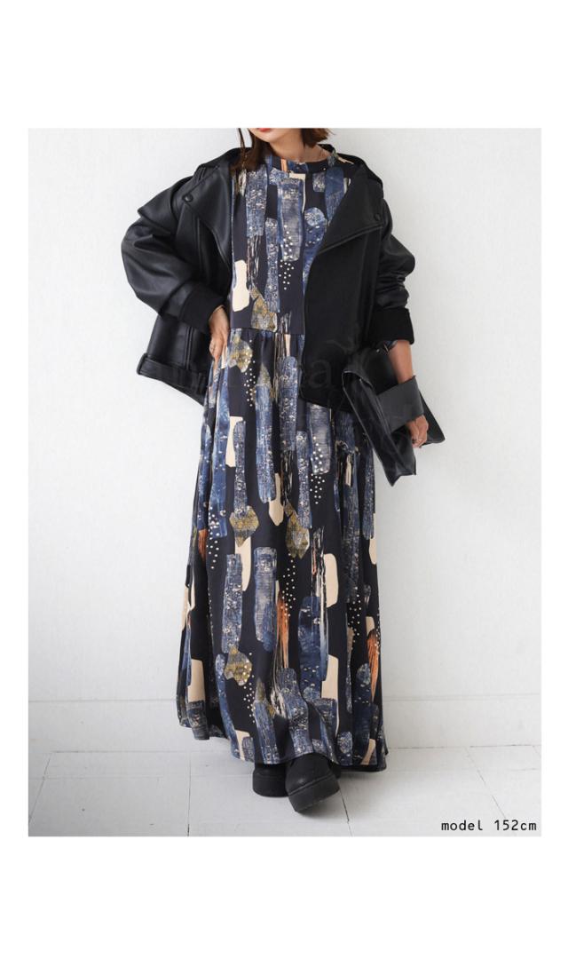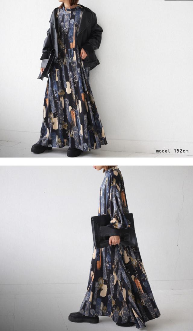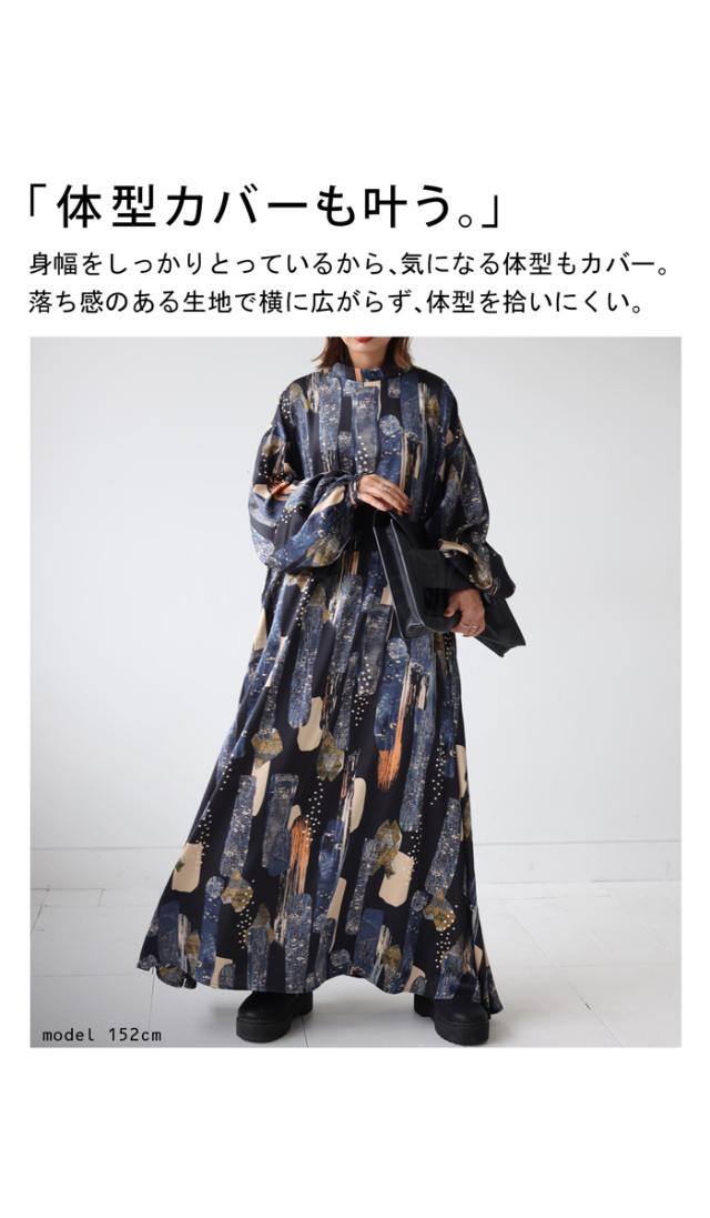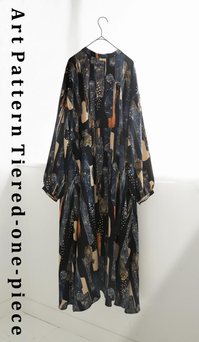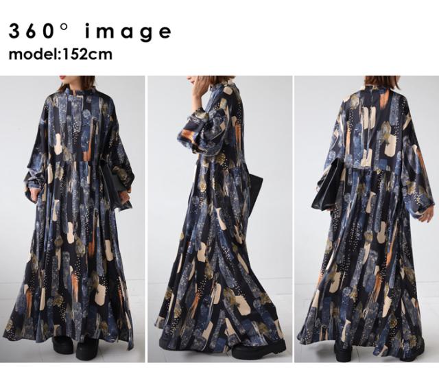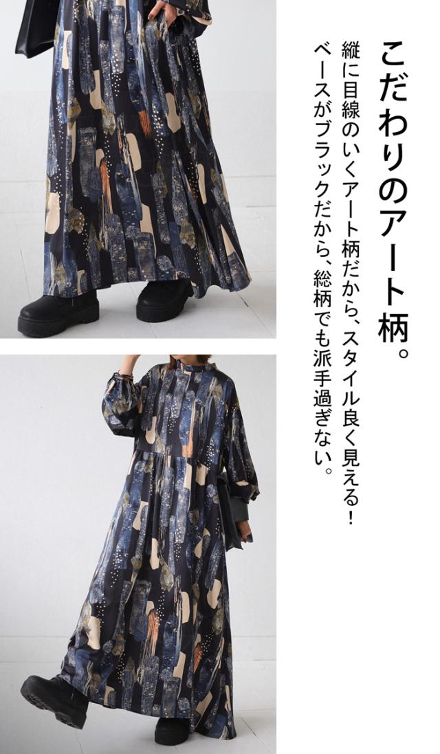 pk-00891 長袖 柄ワンピ 柄 アート ティアード ウエスト切替え ゆったり マキシ丈 Aライン スタンドネック バックファスナー 総柄 大きいサイズ 裏地付き きれいめ オケージョン