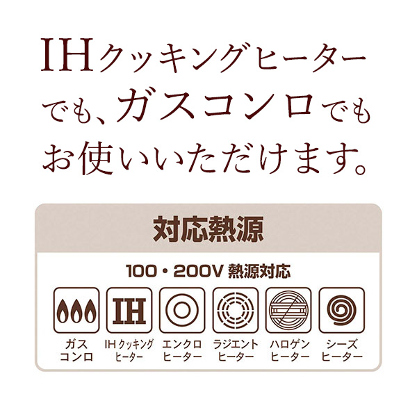 多様な熱源に対応ガスコンロ、IHクッキングヒーターはもちろんのこと、シーズヒーター・ハロゲンヒーター・エンクロヒーター・ラジエントヒーターでご使用いただけます。