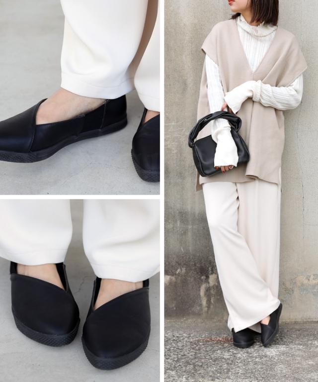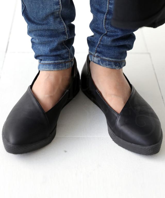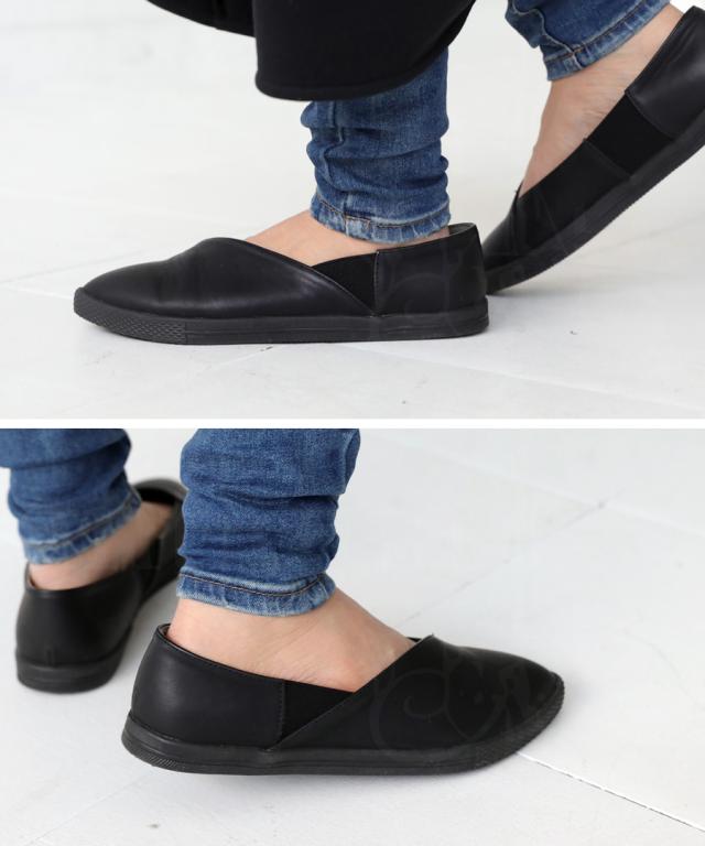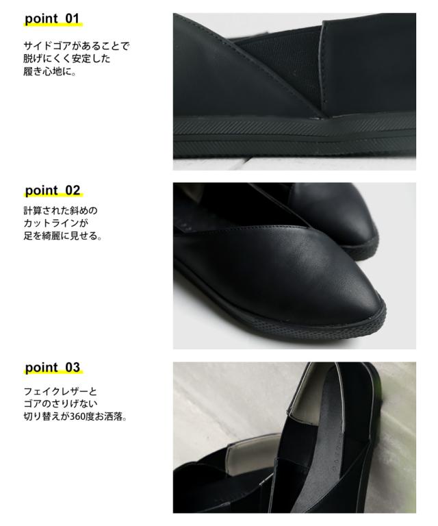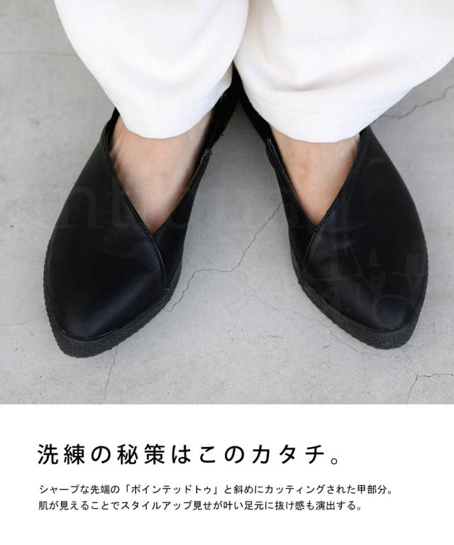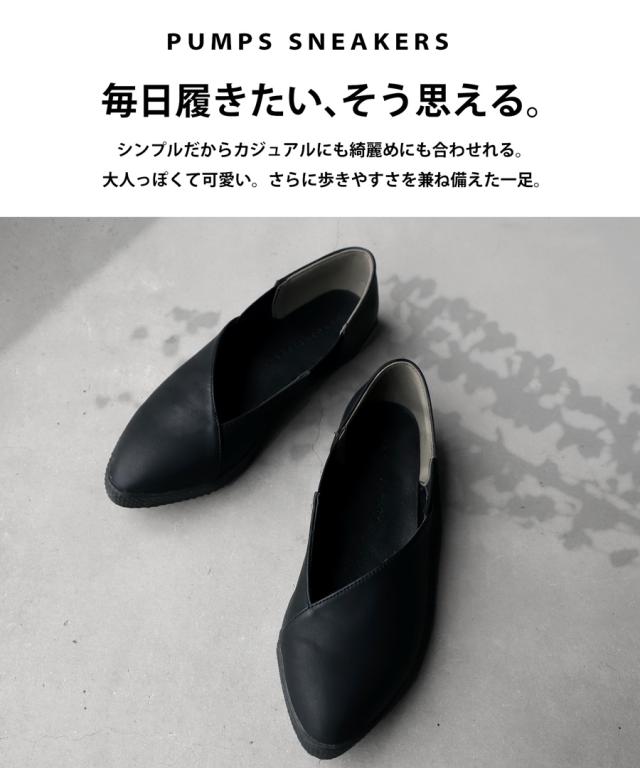 pc-00018 パンプス スニーカー 痛くない 歩きやすい ぺたんこ フラット フラットシューズ ローヒール ポインテッドトゥ ゴア サイドゴム シンプル きれいめ 斜めカット 本革風 マット