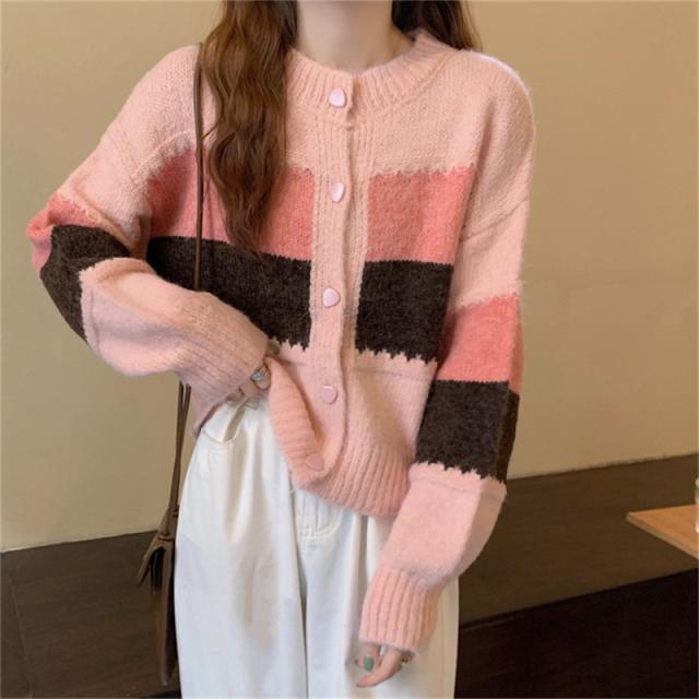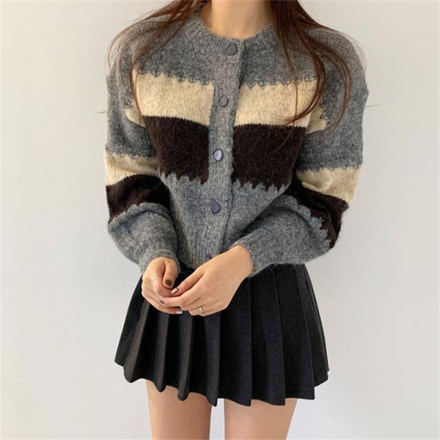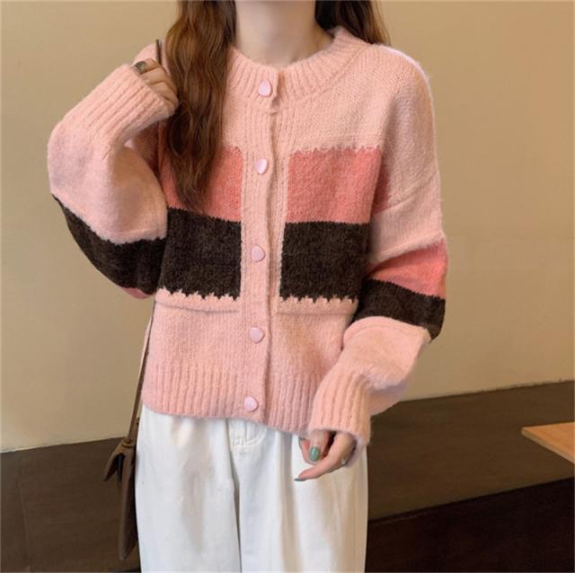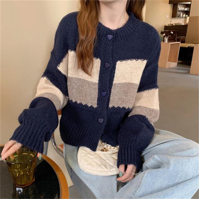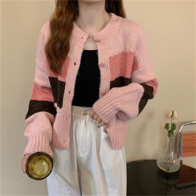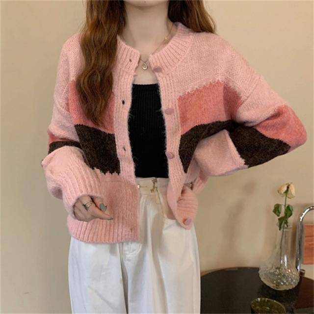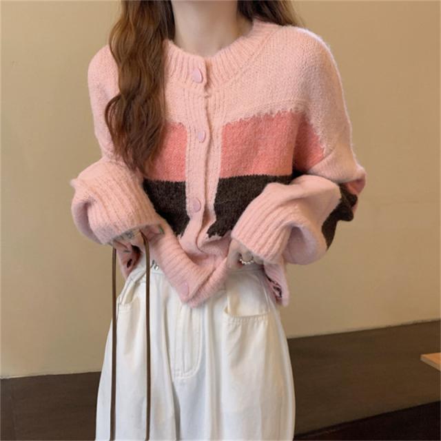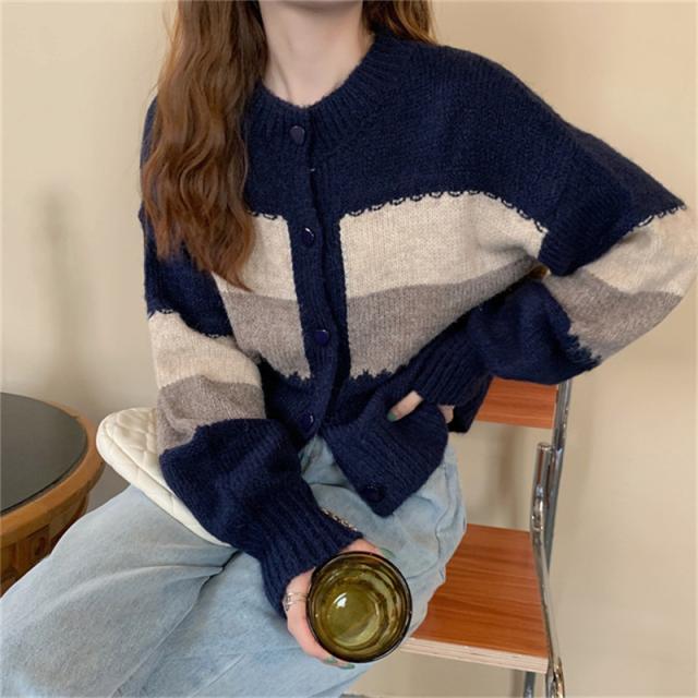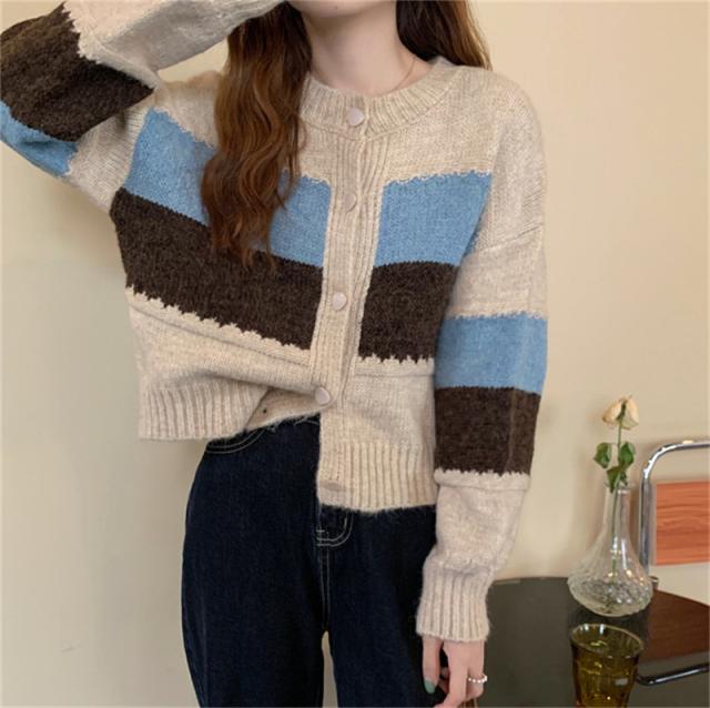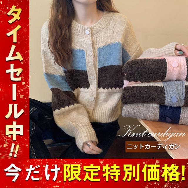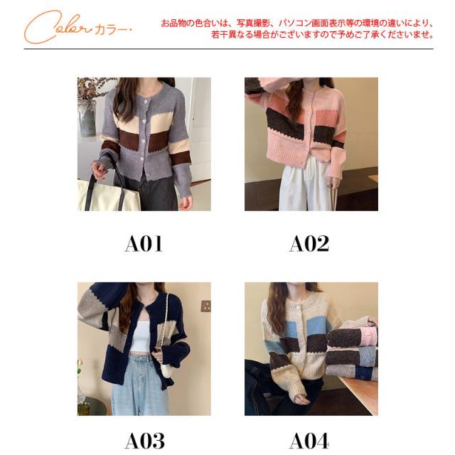 ニットカーディガン レディース アウター 羽織り 長袖 配色 切り替え セーター ヴィンテージ ゆったり カジュアル 着痩せ 春