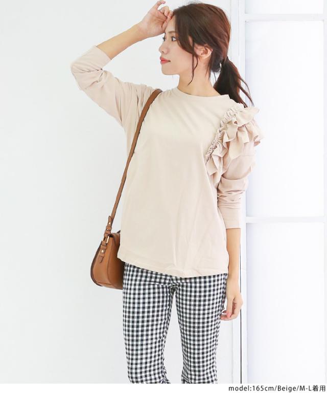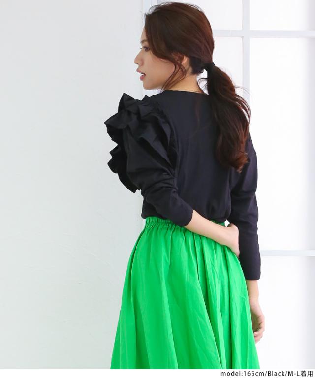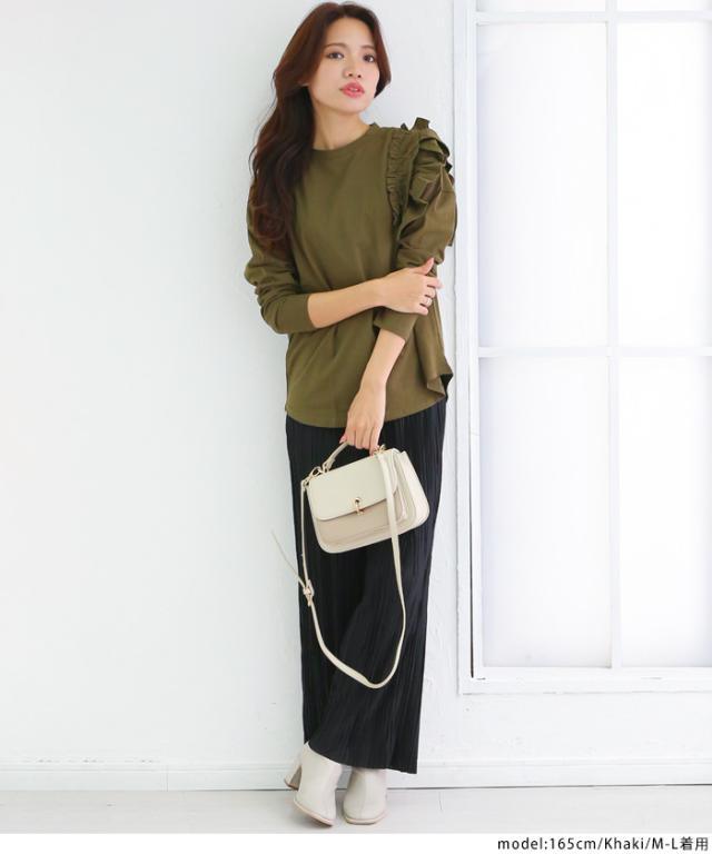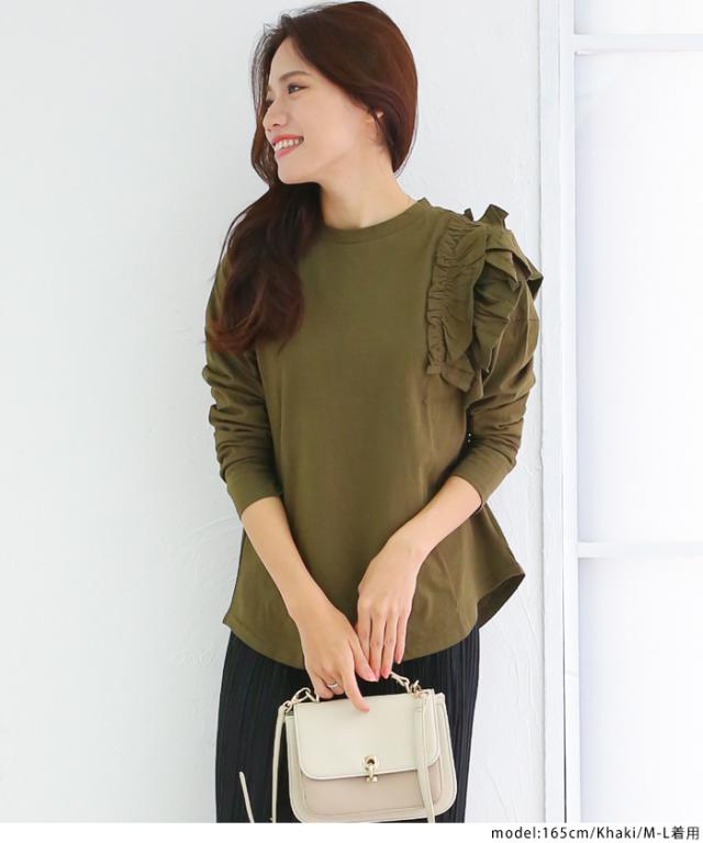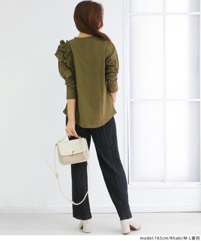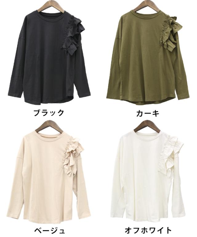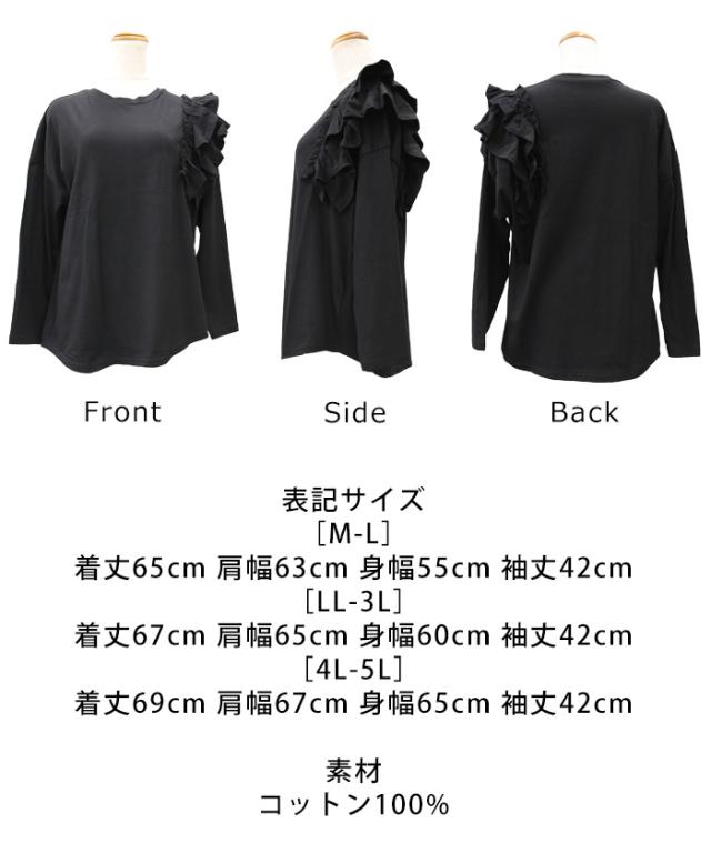 秋新作 大きいサイズ レディース 片袖フリル長袖カットソー レディース 大きいサイズ M L LL 3L 4L5L 黒 白 ベージュ カーキ