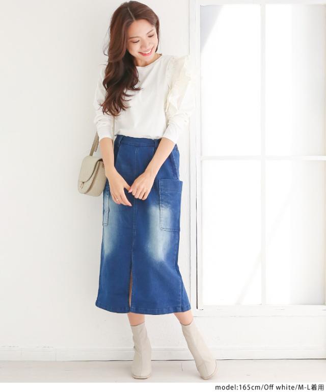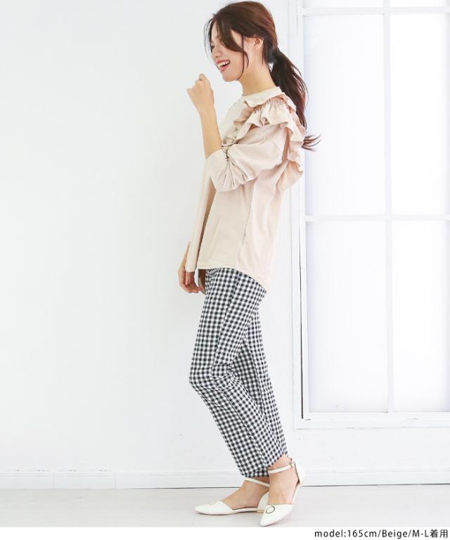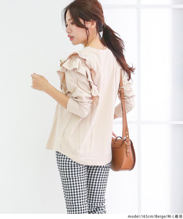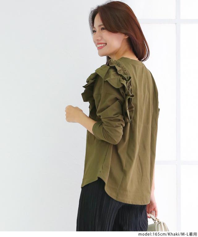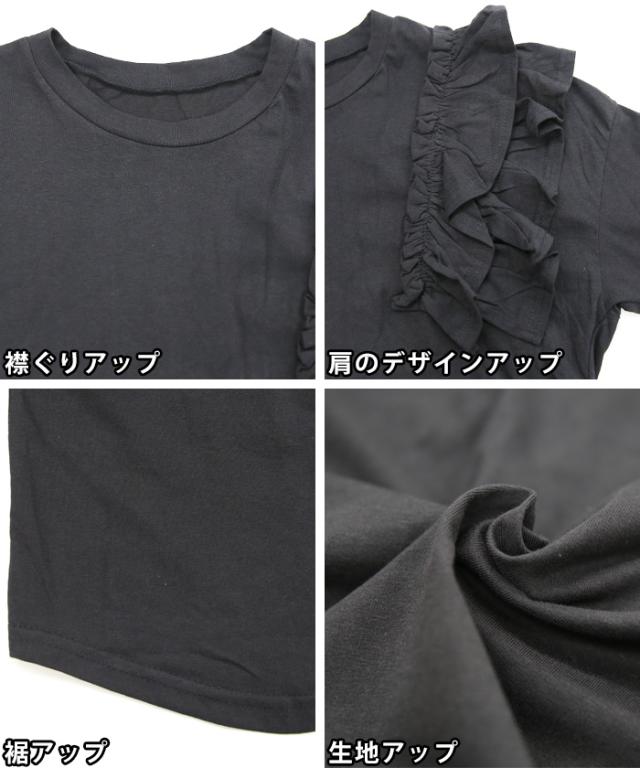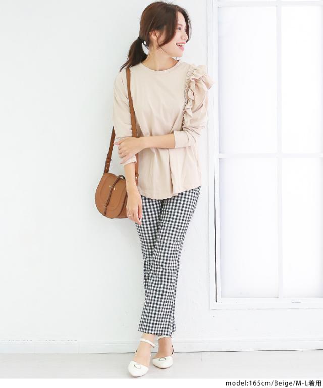 片袖にダブルフリル1があしらわれたデザインで、一枚だけで印象的なコーデに仕上がります。カラーパンツやロングスカートなどボトムスを選ばずスタイリング。コットン100%で着心地も抜群◎普段使いしやすく着回しに困らない4色展開です。
