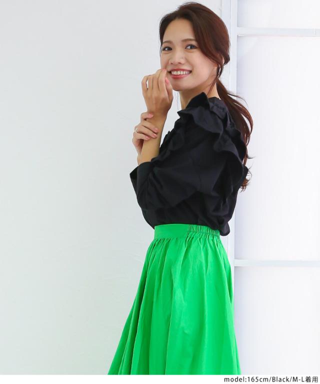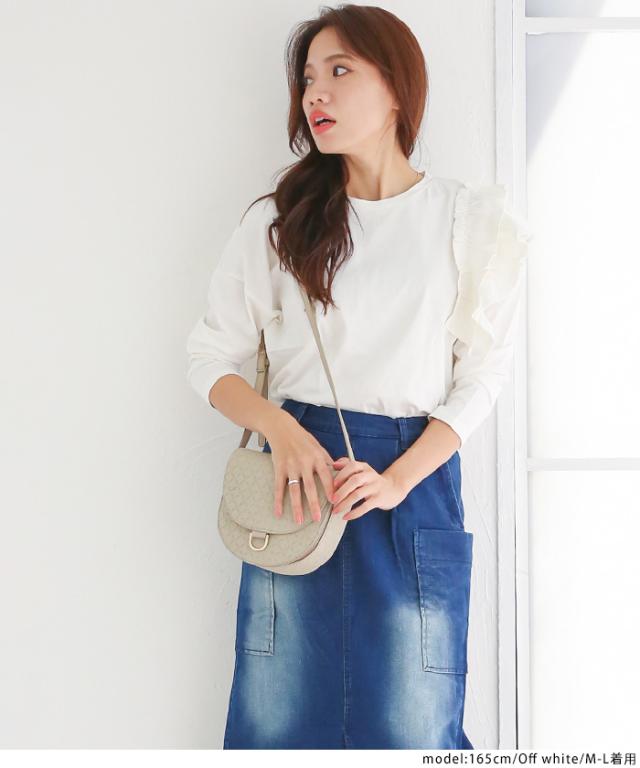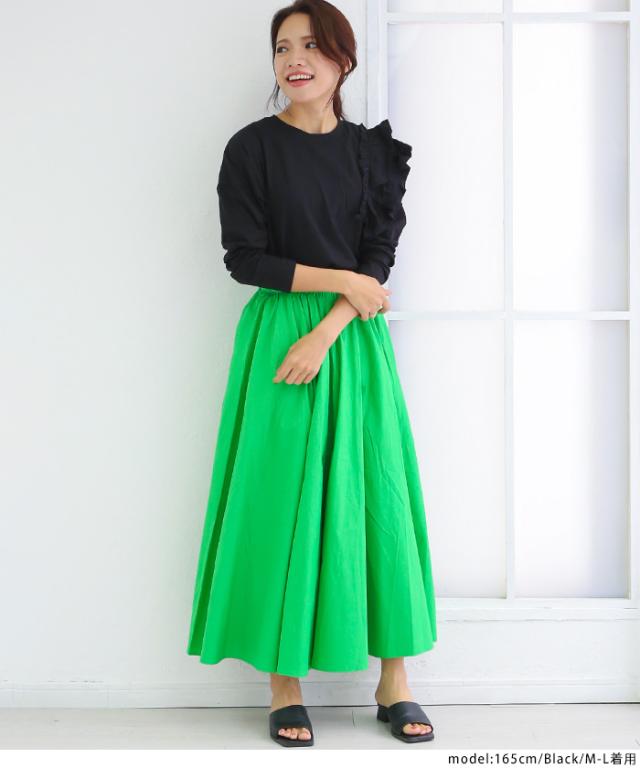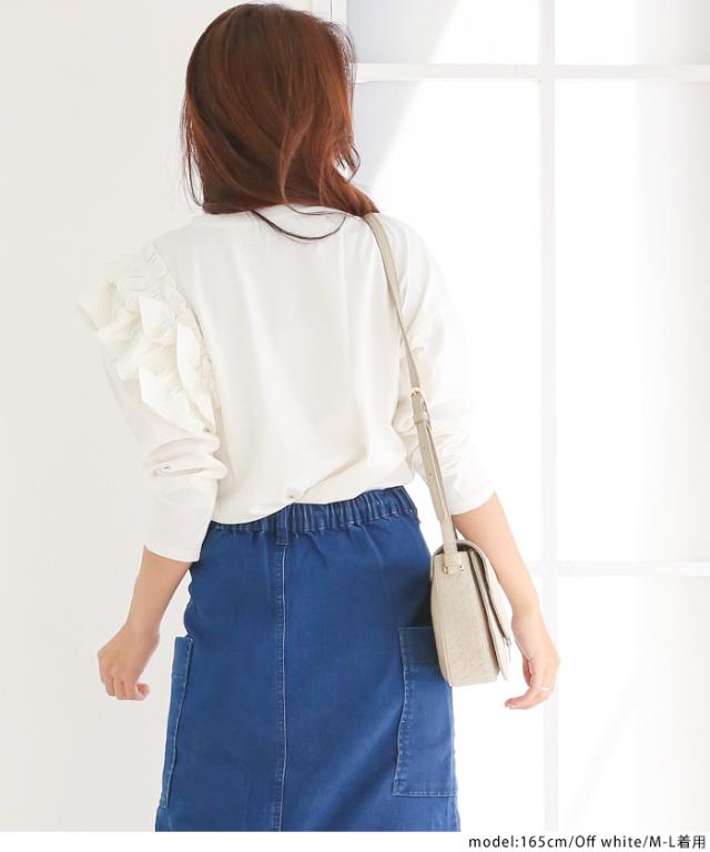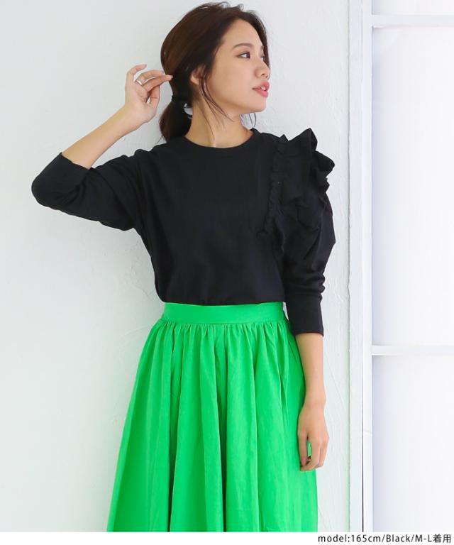 | 片袖にダブルフリル1があしらわれたデザインで、一枚だけで印象的なコーデに仕上がります。カラーパンツやロングスカートなどボトムスを選ばずスタイリング。コットン100%で着心地も抜群◎普段使いしやすく着回しに困らない4色展開です。 |