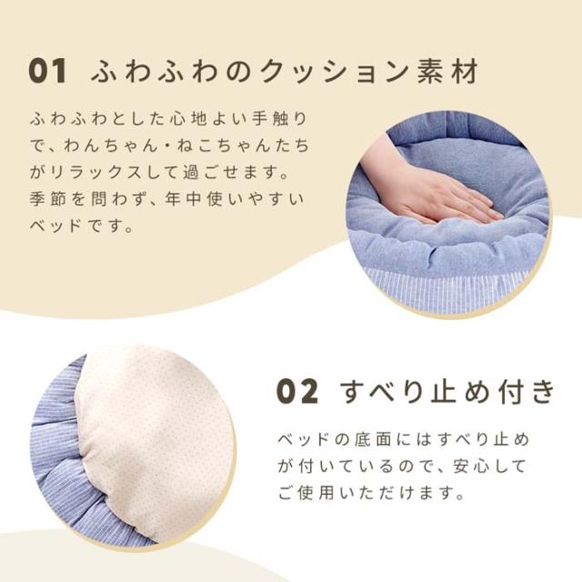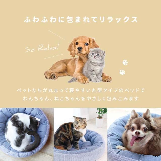 | やさしく包み込む丸型タイプのペット用ベッド。ふわふわのクッション素材。底面にはすべり止め付き。洗濯機で洗えます。 | |