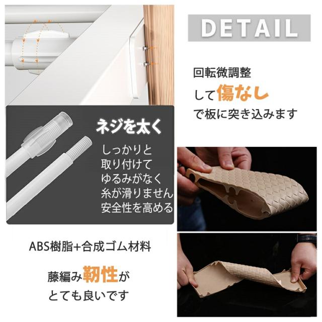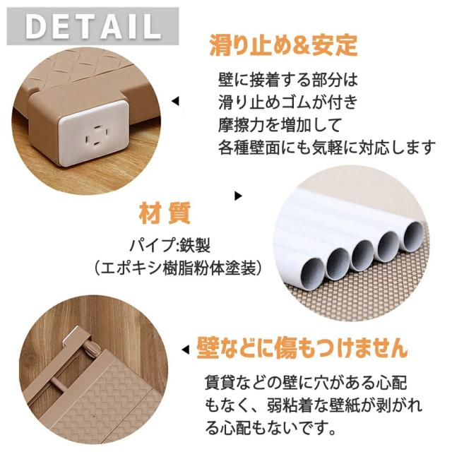 【棚板付き・滑り止め・安定】棚板が5本付いており、平な棚面に小物を載せるのに便利です。壁に接着する部分は滑り止めゴムが付き、摩擦力を増加して、各種壁面にも気軽に対応します。ネジやクギを使わずに壁に突っ張るので、賃貸などの壁に穴がある心配もなく、弱粘着な壁紙が剥がれる心配もないです。