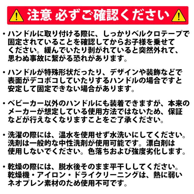 ・ベビーカー以外のハンドルにも装着できますが、本来のメーカーが想定している使用方法ではないため、保証などが行えなくなりますことをご了承ください。