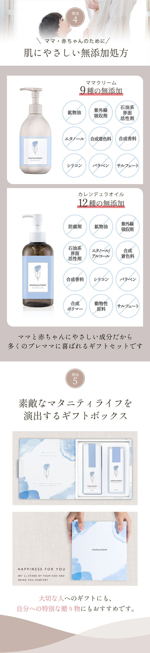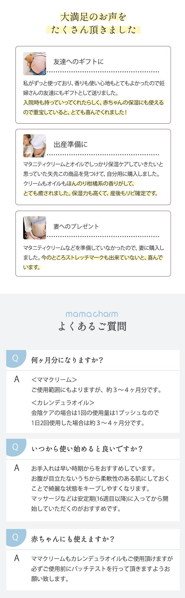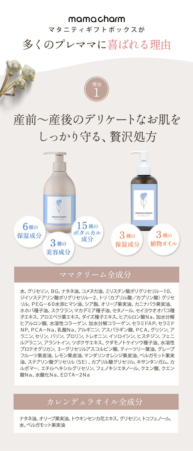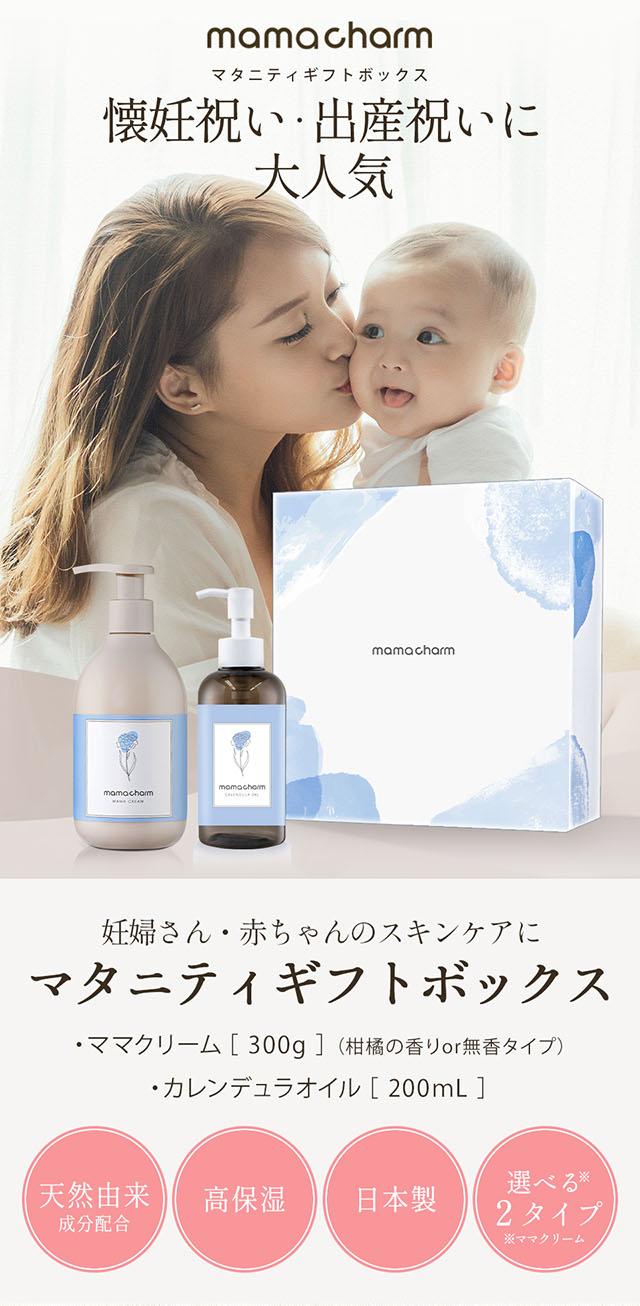 | 商品特徴 | mamacharmより大人気の「妊娠線ケアクリーム」と会陰ケアができる「カレンデュラオイル」のギフトセットが登場! |