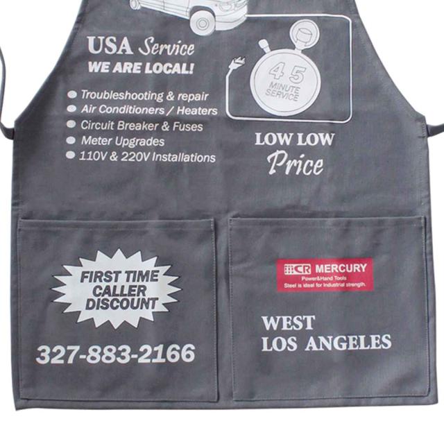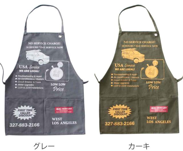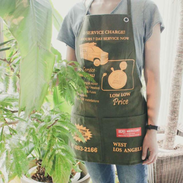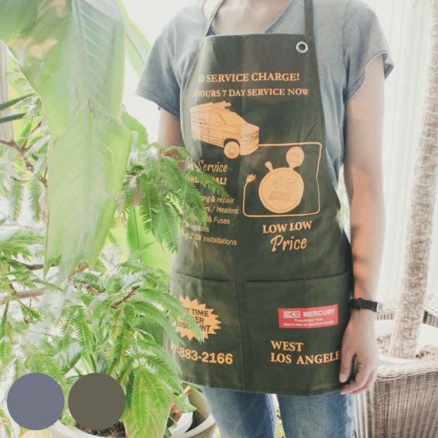 キャンバス地のカジュアルな風合いに、レトロなイラストと英字が配されたビンテージライクな雰囲気。MERCURYのビンテージエプロン・ガレージは、着る人を選ばないカジュアルなデザインです。加えて、膝上のショート丈は動きやすく家での家事はもちろん、外でのガーデニングやDIYなど様々なシーンで活躍します。