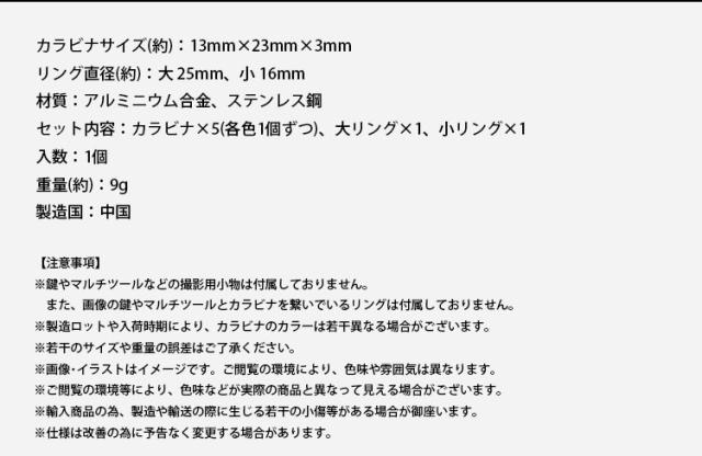 セット内容:カラビナ×5(各色1個ずつ)、大リング×1、小リング×1