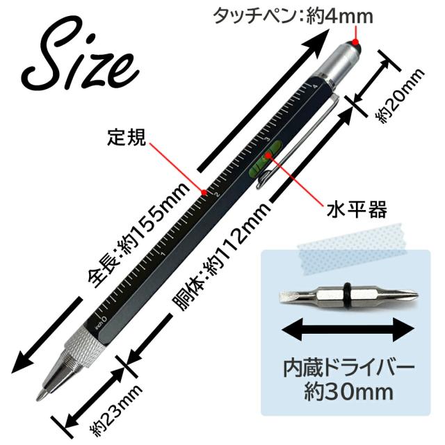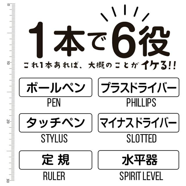 6機能とはボールペン・スタイラスペン・スケール・水平器・精密プラスドライバー・精密マイナスドライバー。