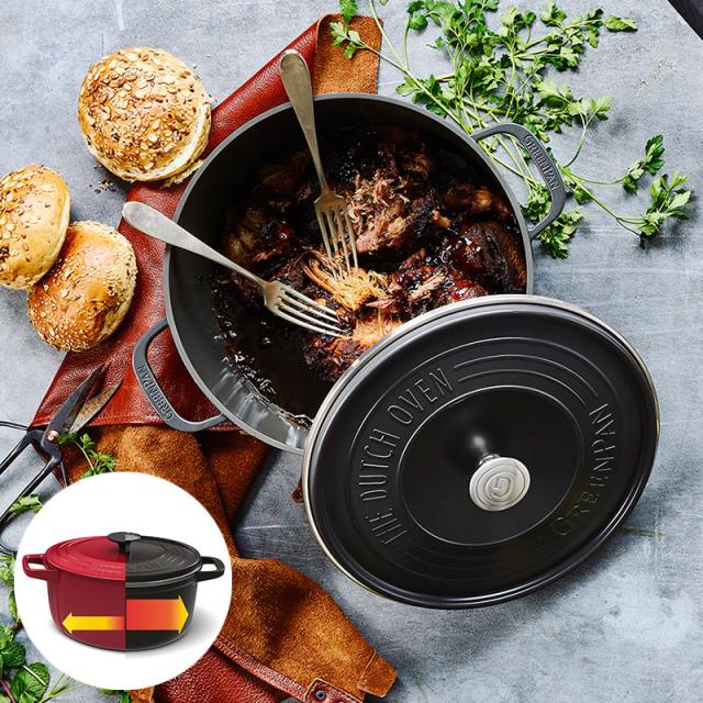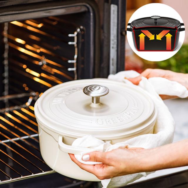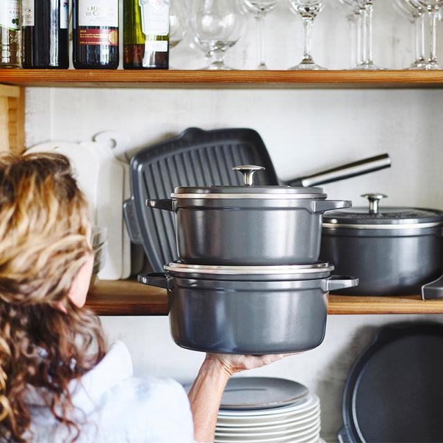 見た目は重厚感のある鉄製鋳物鍋ですが、本体と蓋ともにアルミニウム合金でできているので従来の鉄製鋳物鍋の約半分の重さです。調理中はもちろん、両手でスムーズに持ち上げられるので、高所への収納やお手入れもストレスフリーです。