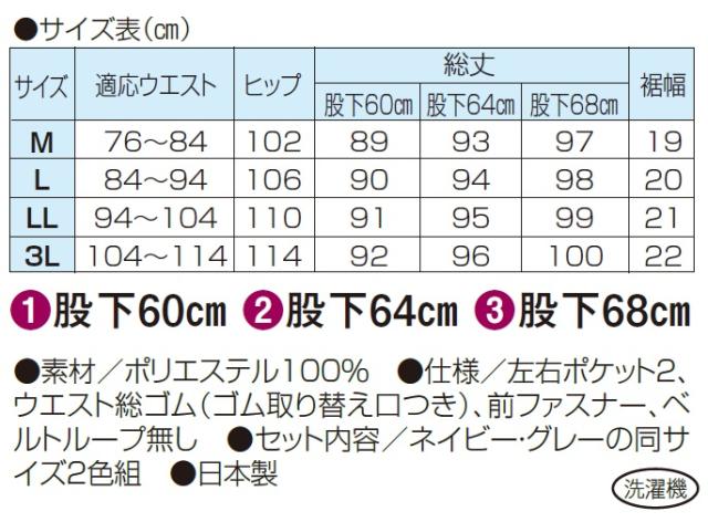 ●仕様/左右ポケット2、ウエスト総ゴム(ゴム取り替え口つき)、前ファスナー、ベルトループ無