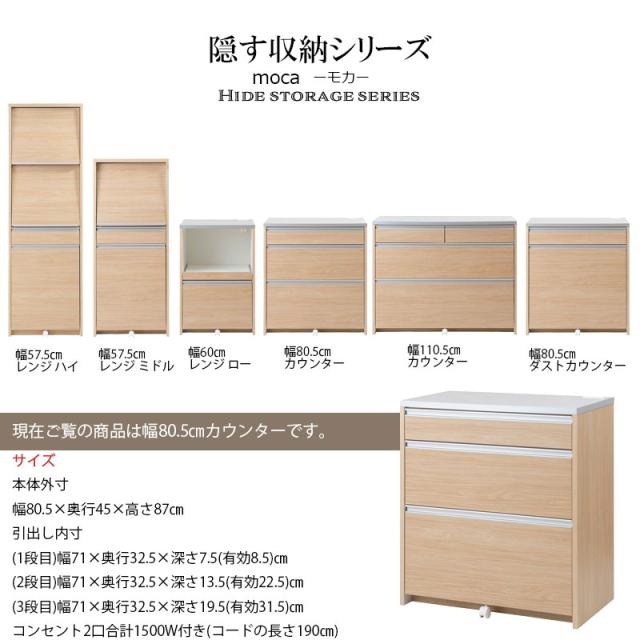 日本製 完成品 幅80.5 キッチンカウンター レンジ台 ホワイトウォッシュ 木目調 木製 食器棚 レンジボード キッチンボード おしゃれ 北欧 鏡面仕上げ 引き出し スリム カウンター(代引不可)【送料無料】