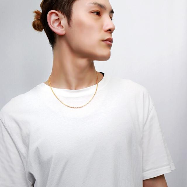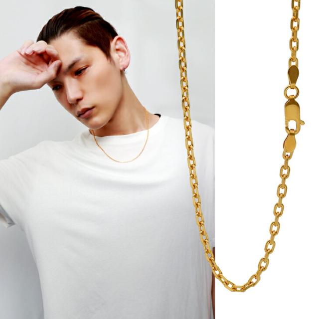 ・商品番号 [CL80-4C-50-GD] 純度の高い金を通常より厚めにシルバー925へと特殊コーティングしたチェーンネックレス。 こっくりとした色味のリッチな純金の輝きが胸元で映えます。 定番人気のあずきチェーン。 4面にカットが入っているため、キラキラと輝き、すっきりとスタイリッシュな見た目です。 幅は男性の胸元にも決まる華やかさのある約2.6mm。 どんな服にも合わせやすく、単品使いはもちろん、重ね着けやペンダントトップと合わせたりとアレンジの幅が広がるデザインです。 長さは使い勝手の良い男性標準サイズ、一番人気の50cmです。 ※コーティングは純金を使用していますが、定着の仕様上K23程度となります。 |