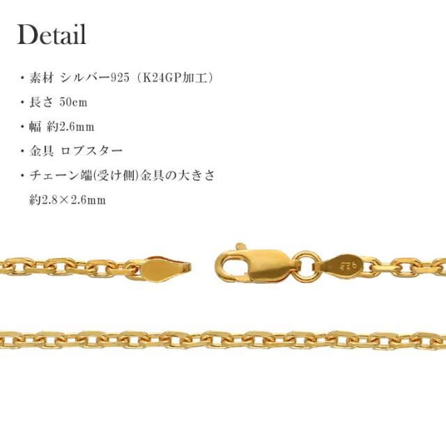 ・素材 シルバー925(K24GP加工) ・長さ 50cm ・幅 約2.6mm ・金具 ロブスター ・チェーン端(受け側)金具の大きさ 約2.8×2.6mm |