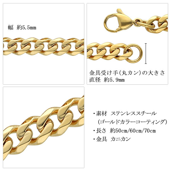 ステンレス ゴールドカラーチェーン 喜平ネックレス チェーン ステンレススチール 喜平チェーン 幅5.5mm 50cm 60cm 70cm 金色 ゴールド