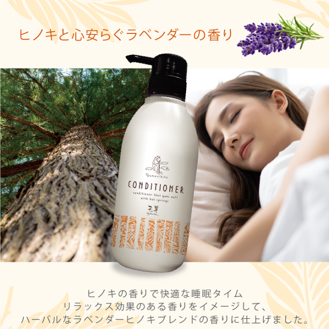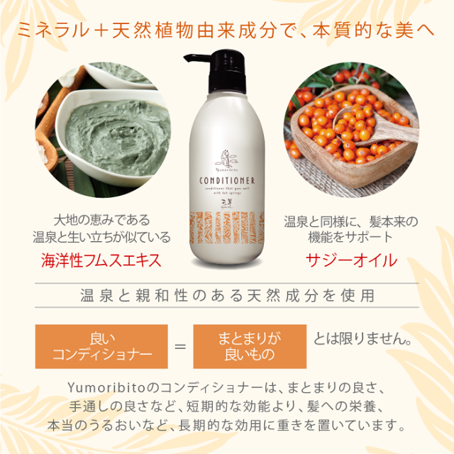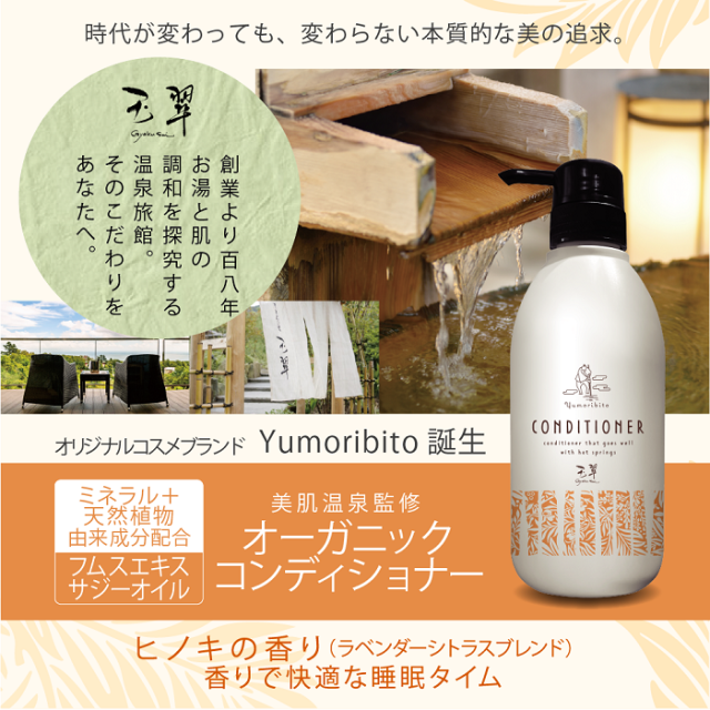 オーガニック トリートメント コンディショナー 温泉配合 ゆもりびと 温泉旅館監修 頭皮にやさしい高保湿でスカルプケア エイジングケア サジーオイル 海洋フムスエキス 天然植物由来成分 ヒノキの香り いい香り