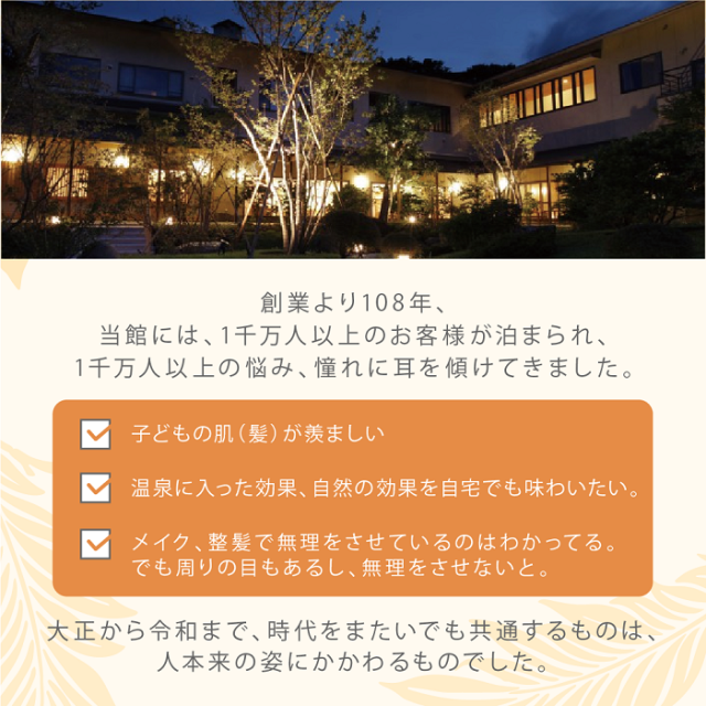 四つの時代、1千万人以上のお客様の声を伺い、お湯と肌、髪の相性を探求。成分や香りにこだわり、ライフスタイルから美を意識できるように仕立てました。