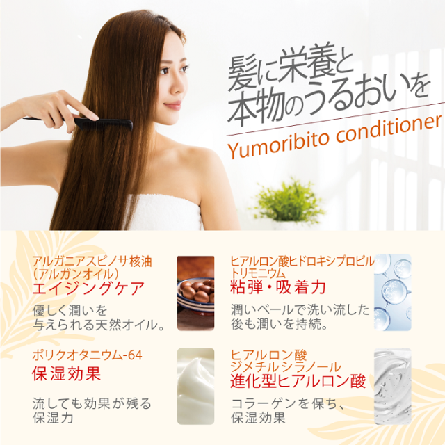 温泉、フムスエキス、サジーオイル、フルボ酸、ヒアルロン酸など従来の機能をサポートする天然成分を贅沢に使用。まとまりより髪への栄養、本物の潤いなど長期的な効用を追求。