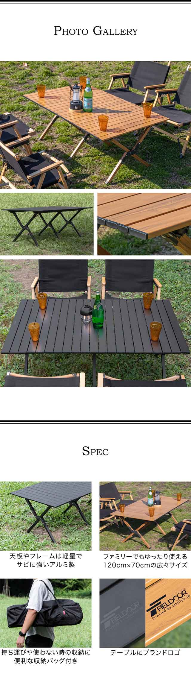 FIELDOOR アウトドアテーブル 折りたたみ ロールテーブル ローテーブル 120cm×70cm 高さ45cm 大きい アルミ 軽量 コンパクト バーベキューテーブル アウトドア キャンプ レジャーテーブル BBQ ブラック 木目調 折り畳み 金属 1年保証 送料無料
