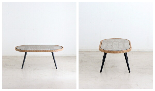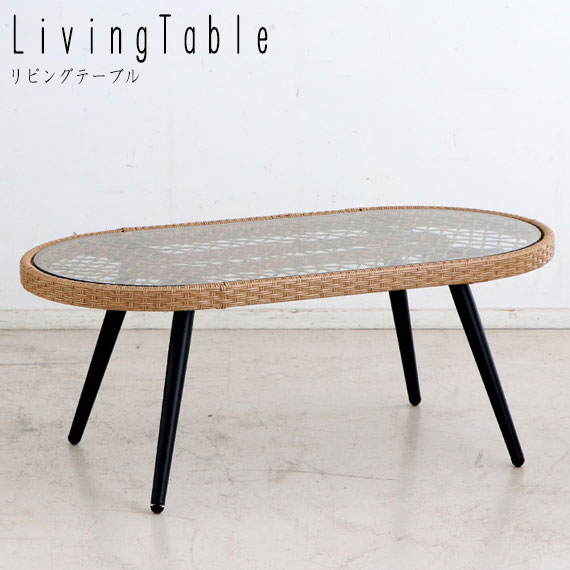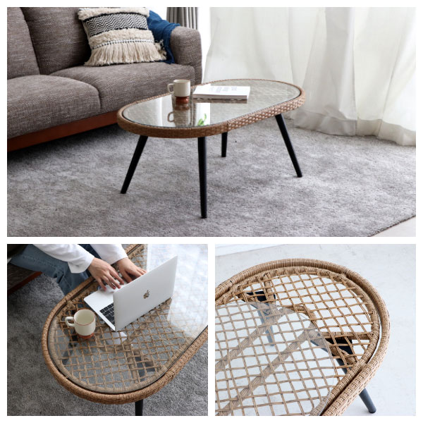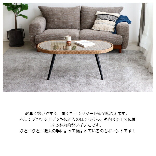 RISONEA リゾネア リビングテーブル (軽量 丸み ベランダ ウッドデッキ 手編み ガラス天板 日本製 国産 海外リゾート アウトドア 金属フレーム エポキシ粉体塗装 ラタン調 籐 ナチュラル アジアン 上品 高級感 おしゃれ)