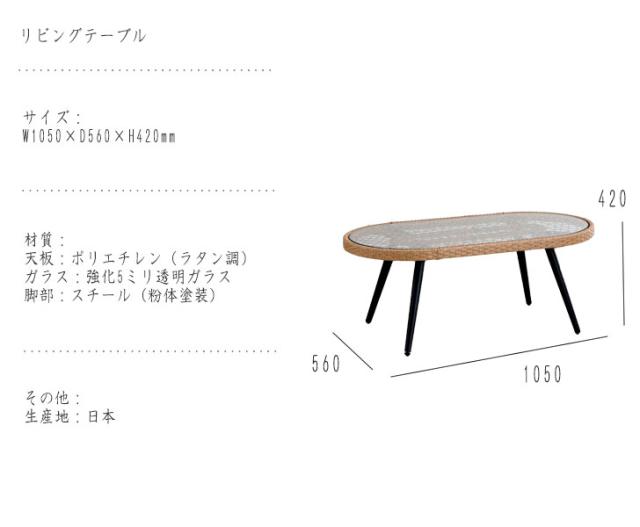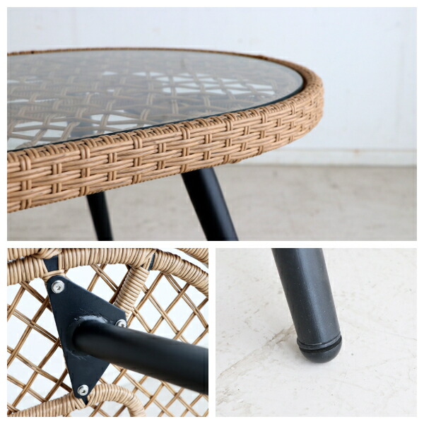 | 材質 | 天板:ポリエチレン(ラタン調) ガラス:強化5ミリ透明ガラス 脚部:スチール (粉体塗装) |