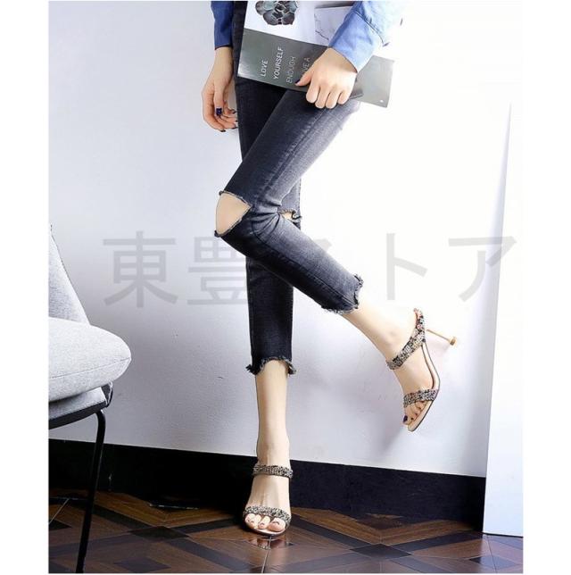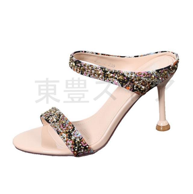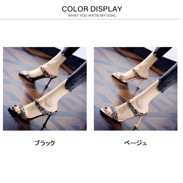 レディース ハイヒール ミュールサンダル 履きやすい 夏 サボサンダル ストラップ ピンヒール キラキラ パーディシューズ 美脚 新作 細いかかと