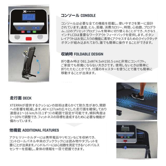 ベルト部は「40cm×127cm」の広い走行面を持ち、XTERRAsoftクッションテクノロジー・最大傾斜10%の調整機能な多機能さを持ち、効果的なトレーニングを支えます。