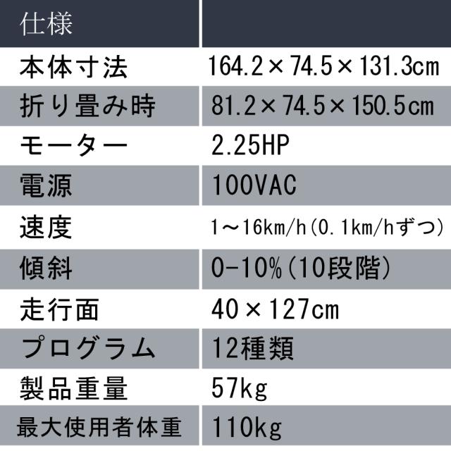 | パネル表示 | 速度、傾斜、距離、消費カロリー、心拍数、プログラム、時間 |