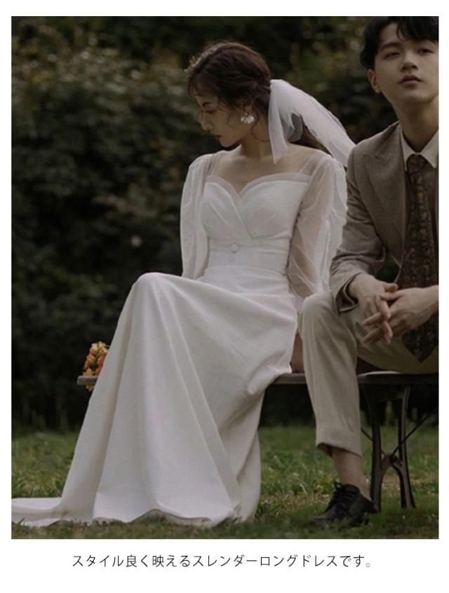 深いVネック ウェディングドレス ロングスリーブ シースルー シンプル ブライダル トレーンドレス 披露宴 ロングドレス 人気 大きいサイズ大人 上品 マキシ丈 海外旅行 写真撮影 ドレス 白 ワンピース ビーチフォト 前撮り 後撮り