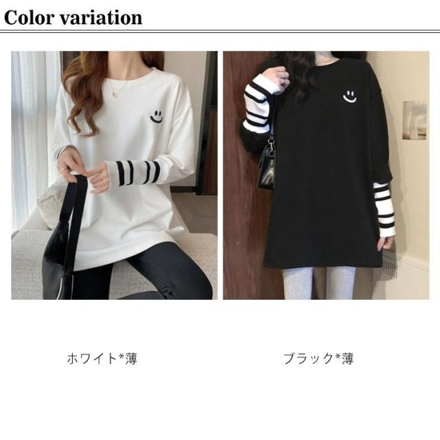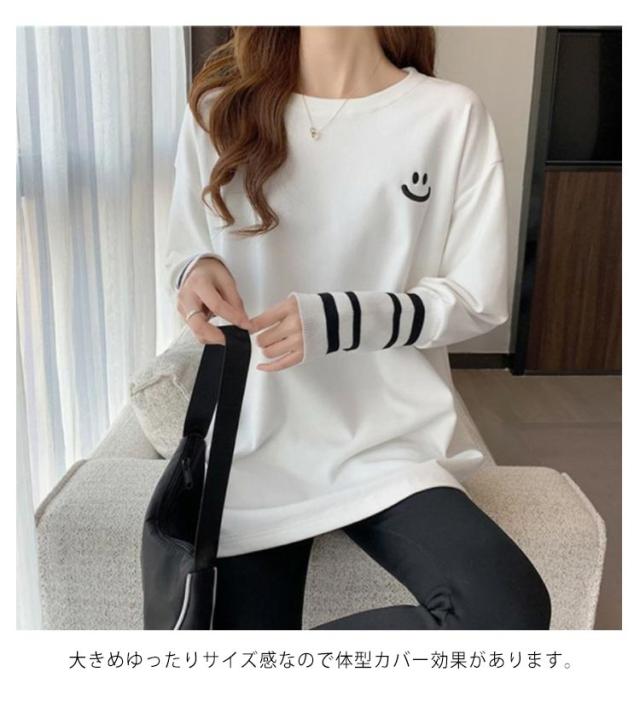 スマイル柄 Tシャツ 長袖 レディース 送料無料 切り替え袖 カットソー トップス プルオーバー ロングTシャツ ロンT ビッグTシャツ カジュアル 綿 大人 女性 春 夏 秋 薄手 M L XL 2XL