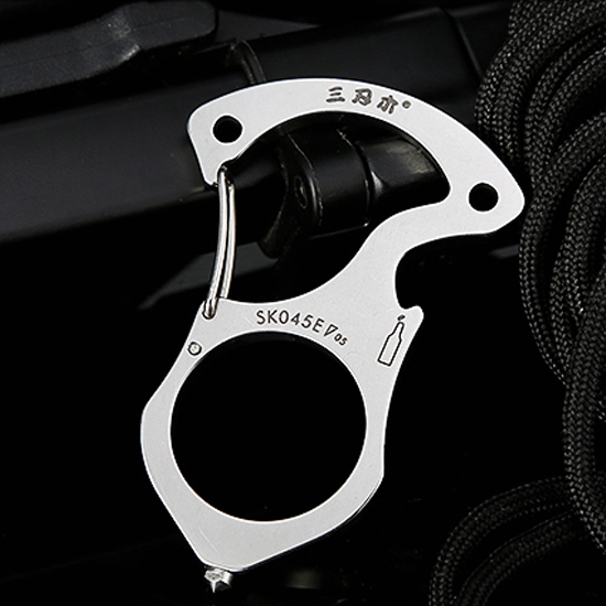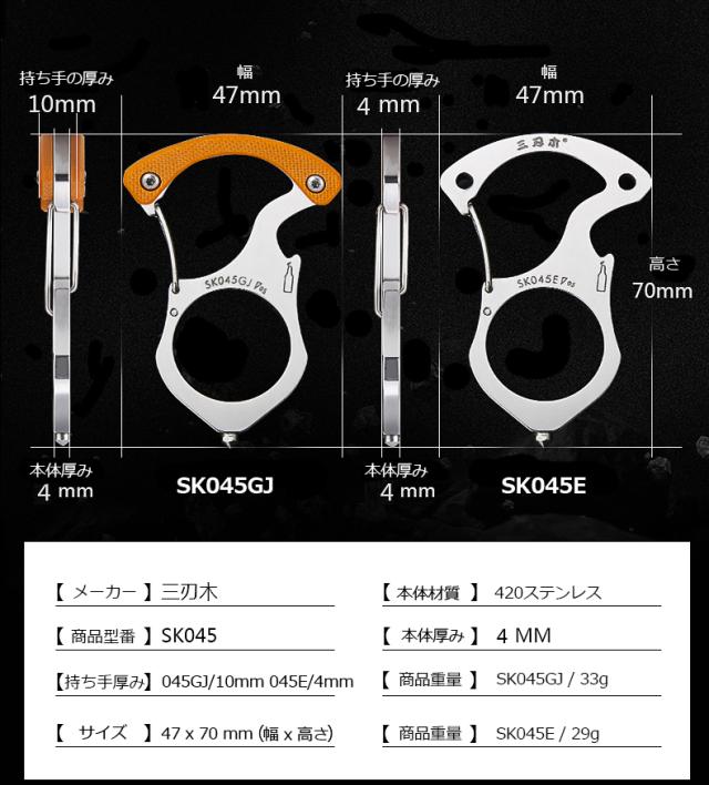 丈夫な420ステンレス鋼を使用した本体先には高硬度タングステン鋼が取り付けられています。車内から緊急時の脱出時に窓ガラスを破壊したり、ブロックやレンガの破壊も可能にします。SK045Eはボトルオープナーも備わっています。