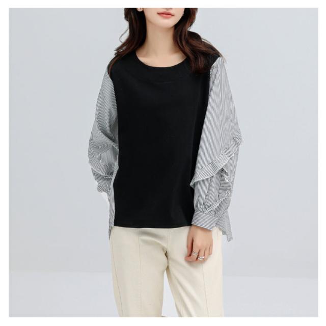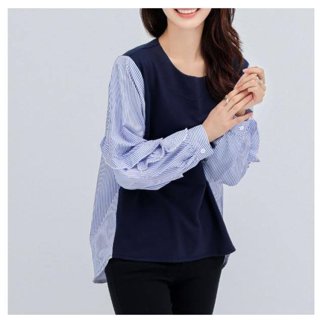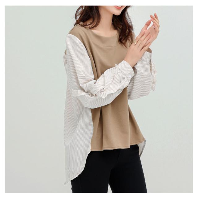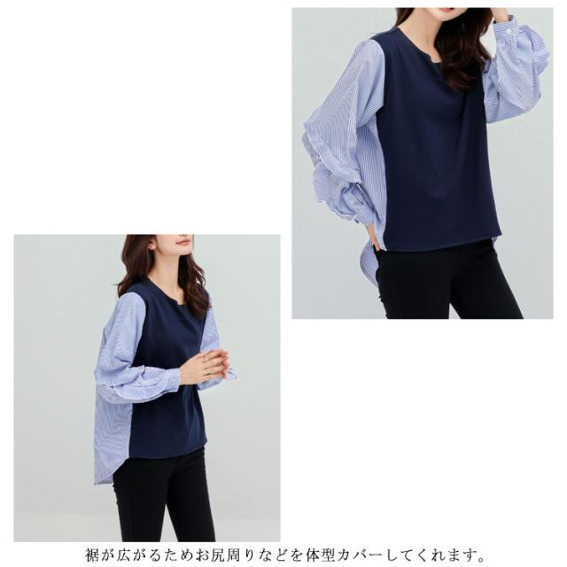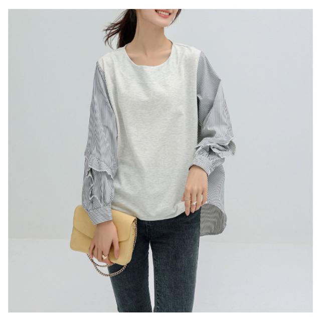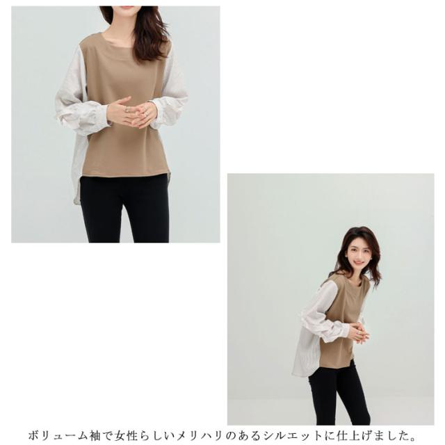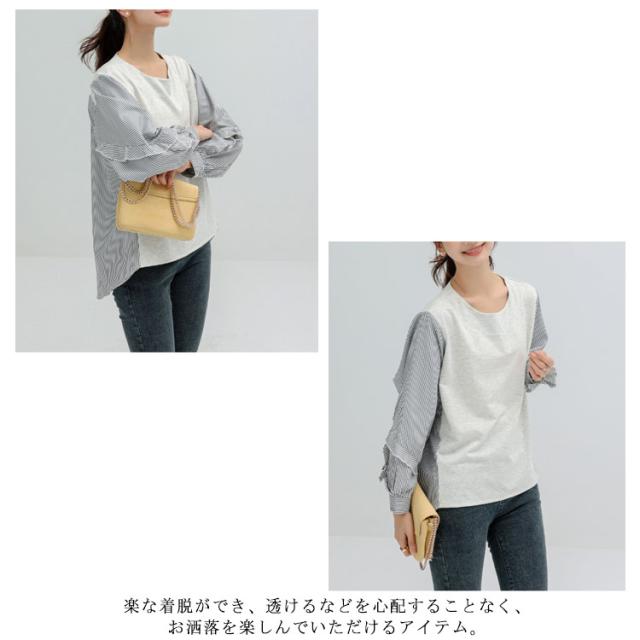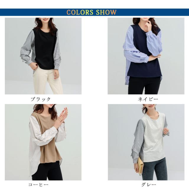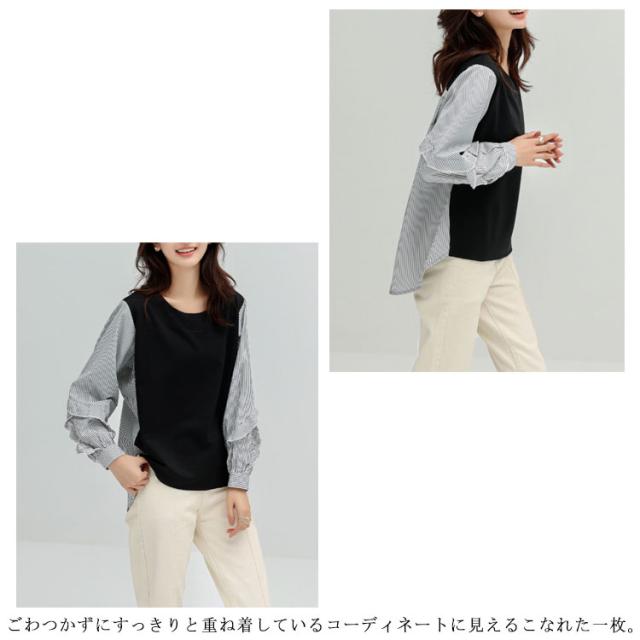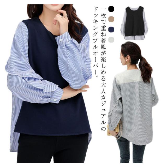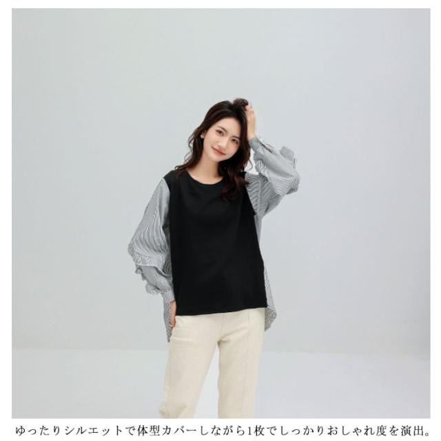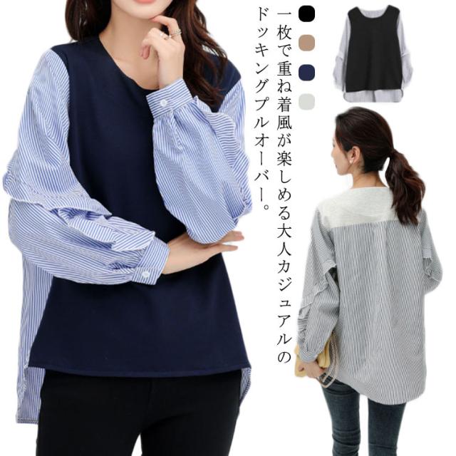 送料無料 カットソー Tシャツ レイヤード風 トップス ドッキング プルオーバー チュニック ブラウス 長袖 ボリュームスリーブ 切替 重ね着風 レイヤード 異素材 ストライプ柄 トップス ゆったり 体型カバー カジュアル