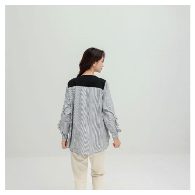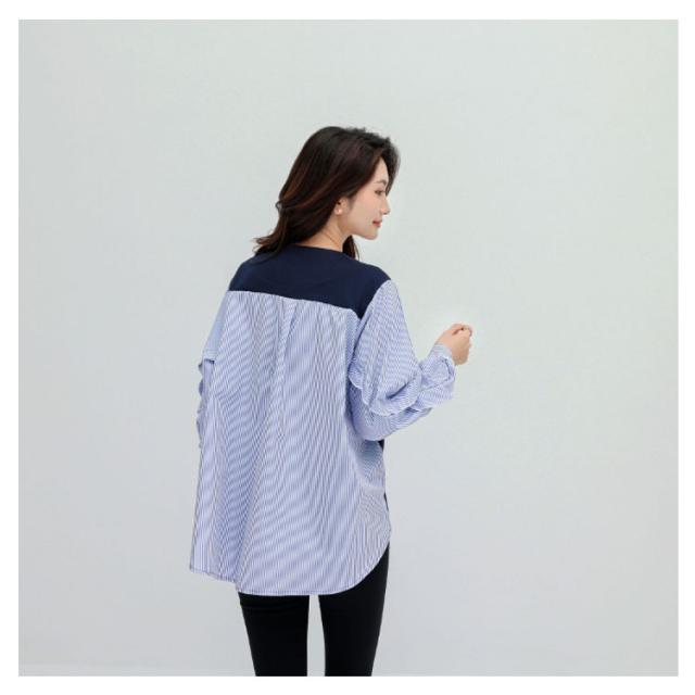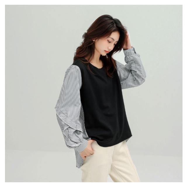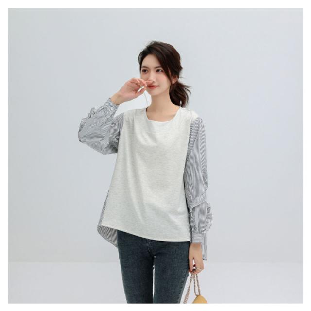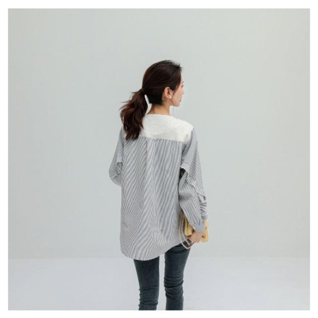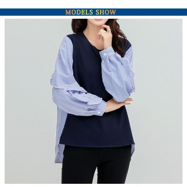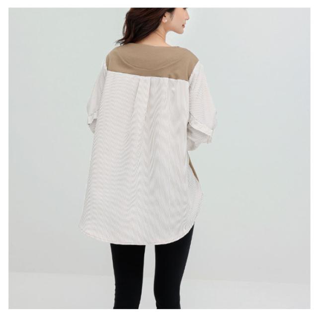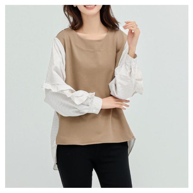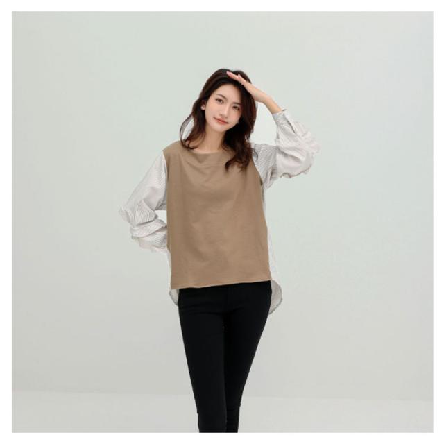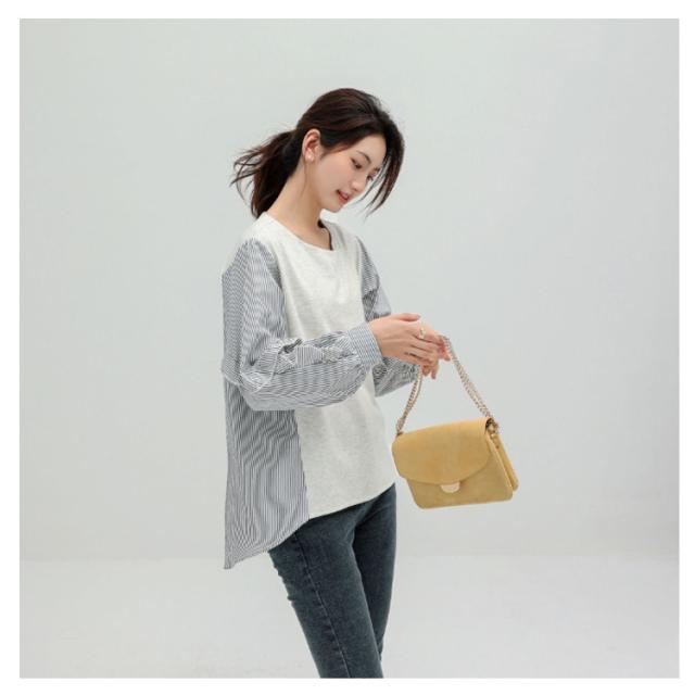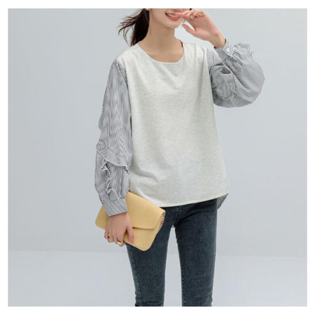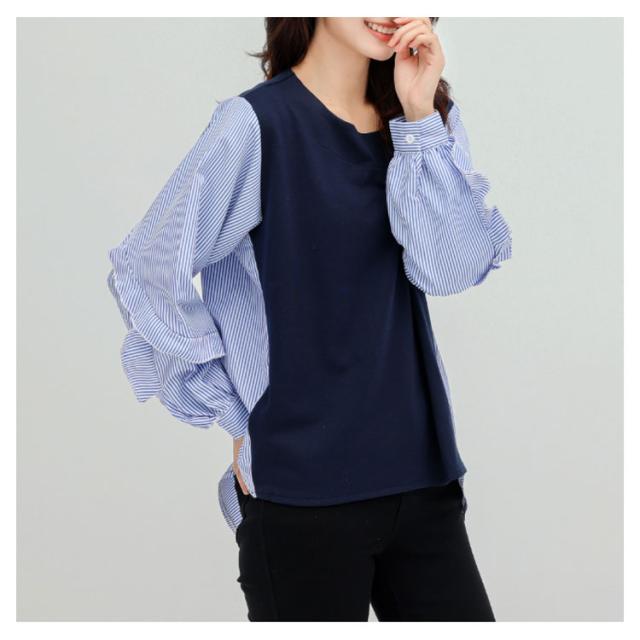 送料無料 カットソー Tシャツ レイヤード風 トップス ドッキング プルオーバー チュニック ブラウス 長袖 ボリュームスリーブ 切替 重ね着風 レイヤード 異素材 ストライプ柄 トップス ゆったり 体型カバー カジュアル