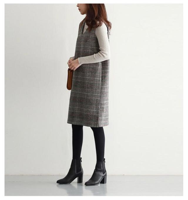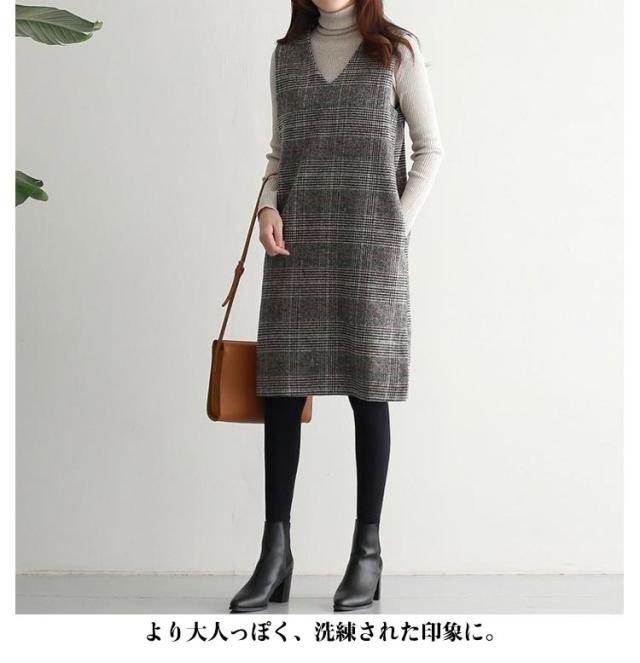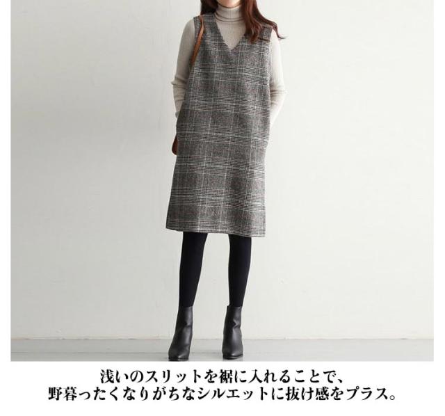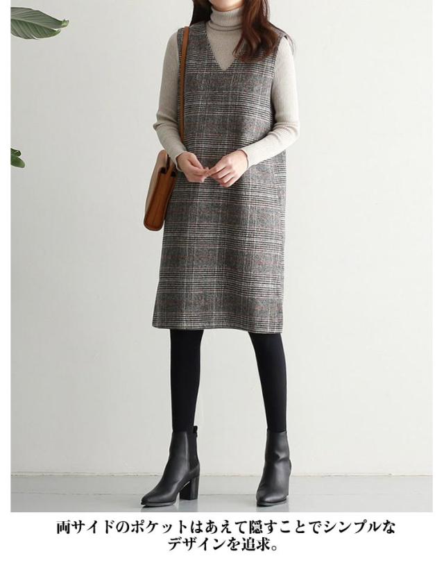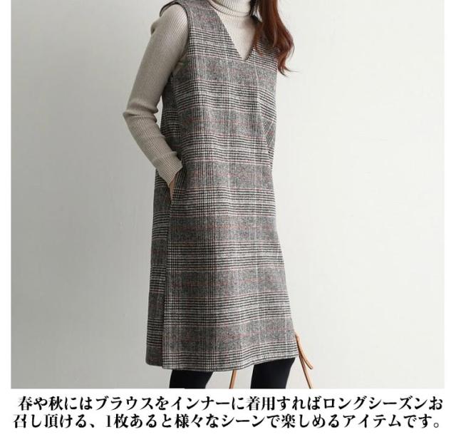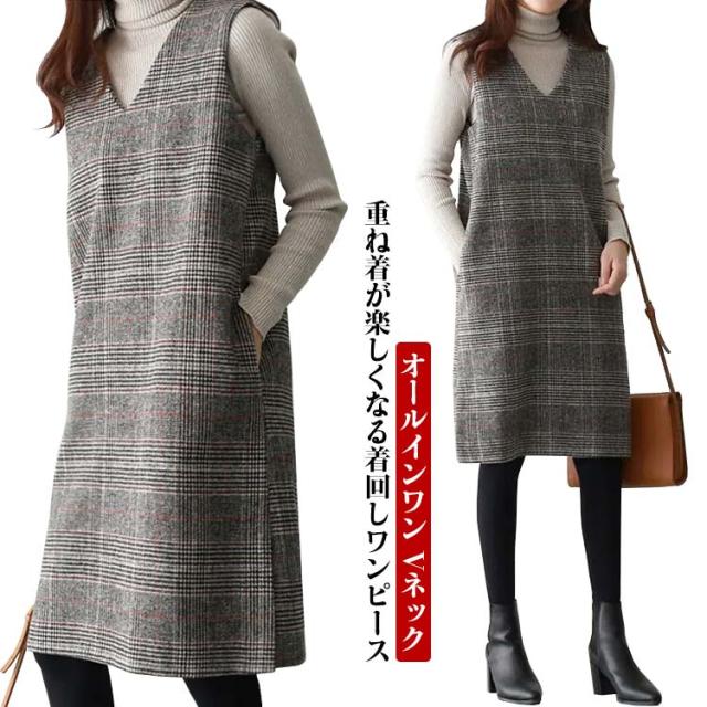 上品 ワンピース 秋 グレンチェック レディース ジャンパースカート オールインワン Vネック 大人 ジャンスカ ワンピ ノースリーブ タンクワンピース 重ね着 おしゃれ 着痩せ 春 秋 冬 ママファッション おしゃれ