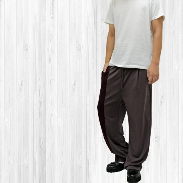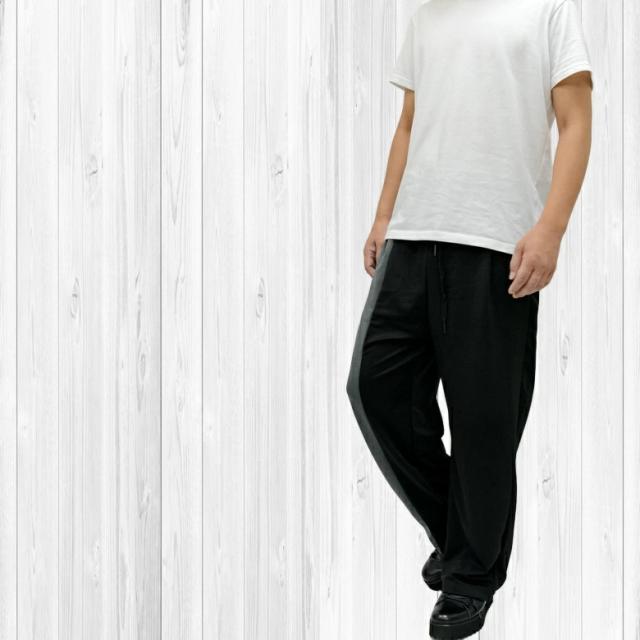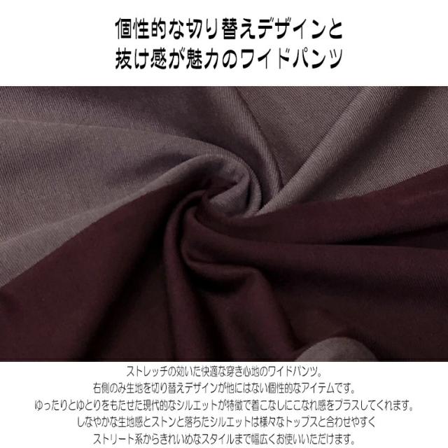 右足に配したライン状の切替デザインがポイントのイージーワイドパンツ。
