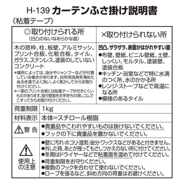 ネジや工具が不要のテープタイプのカーテンふさ掛けです。壁に穴を開けずに設置出来るため、賃貸でも安心してお使いいただけます。鍵や小物を掛けるなど、カーテンのふさ掛け以外でもお使いいただけます。