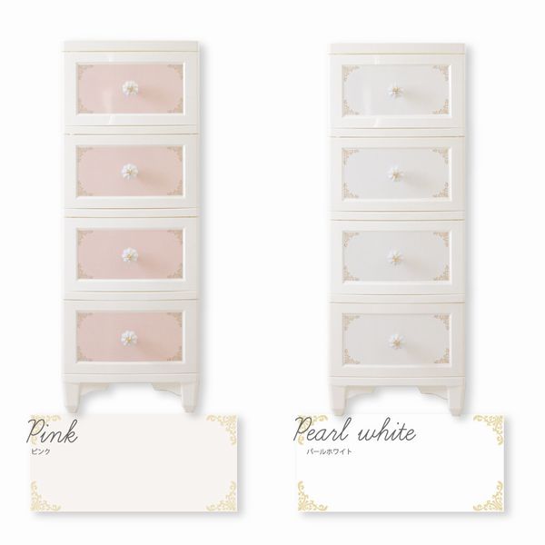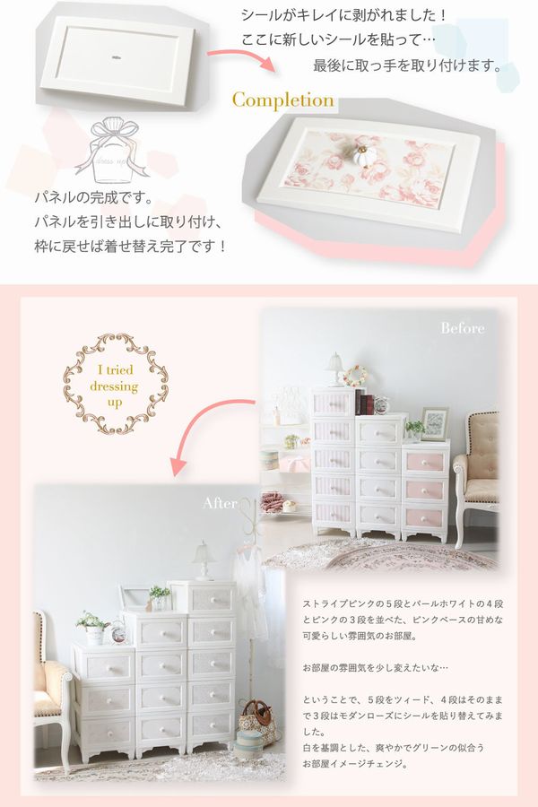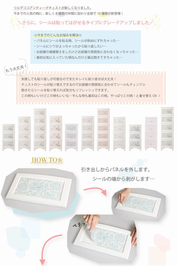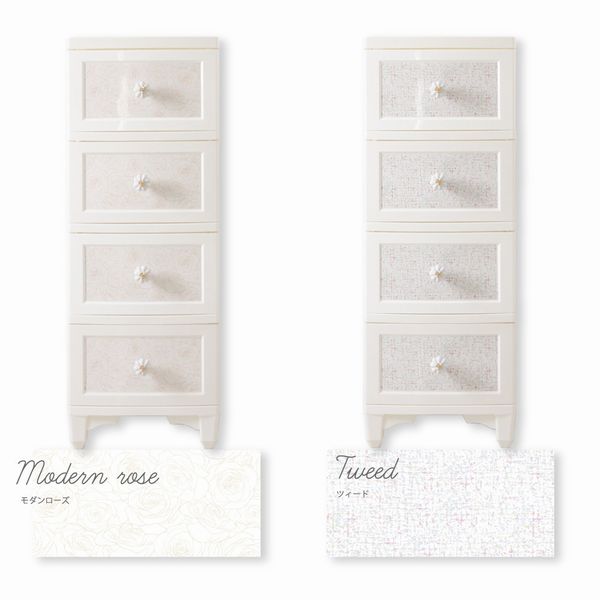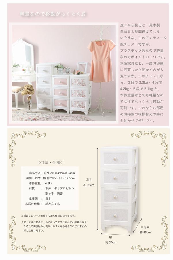 | 【4段 リルデココ ドレスチェンジチェスト 】 ◆商品説明 リルデココのアンティークチェストが新しくなりました! 張って剥がせるシールで、気軽に模様替えができます♪ ストライプ、ダマスク、ローズ、ツイードなど、 豊富な新デザインの追加により、お部屋をさらにコーディネートできます! 細部にもとことんこだわり、猫脚とフラワーモチーフの陶器の取っ手をつけることで 高級感も演出しました。 幅広い年代の方に気に入っていただけるインテリアです♪ プラスチック製チェストなので軽くて女性でも持ち運びラクラク♪ 浴室の収納に…タオルや下着、パジャマなどの収納に。 もちろんお部屋の収納チェストとしてもお使い頂けます。 ◆お届け仕様:組み立て式 引き出しの柄はシールで貼って頂く仕様です。 日本製 |