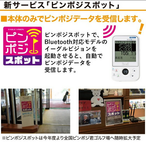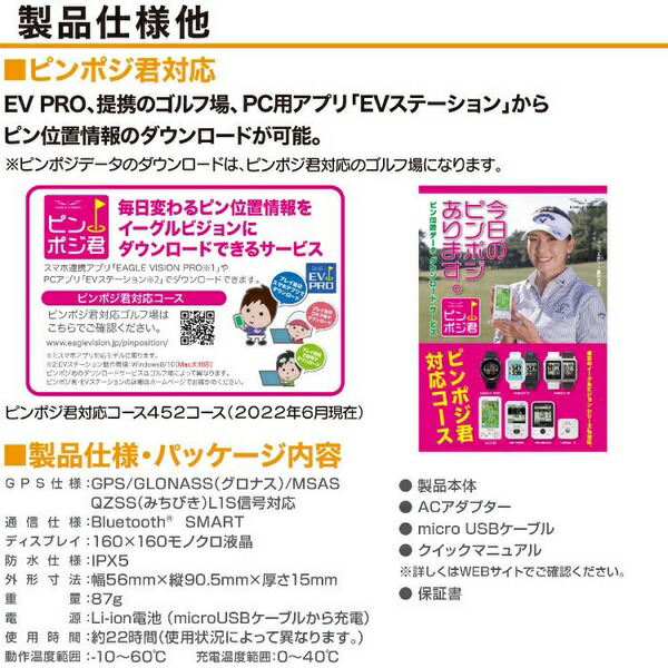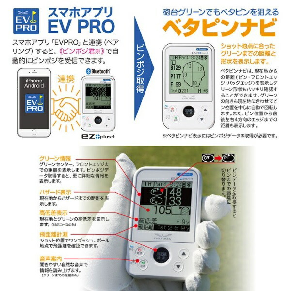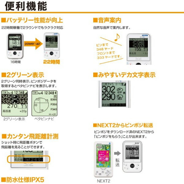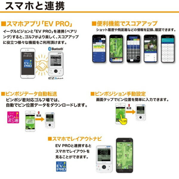 でか文字表示や2グリーン同時表示・音声案内・スコアカード等の便利機能はそのままに、Bluetoothを搭載したことにより、スマホアプリEV PROやベタピンナビ・ピンポジスポット対応等新たな機能も追加されました。