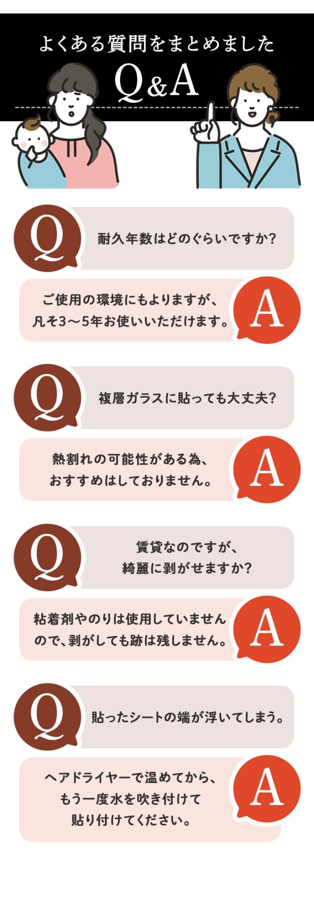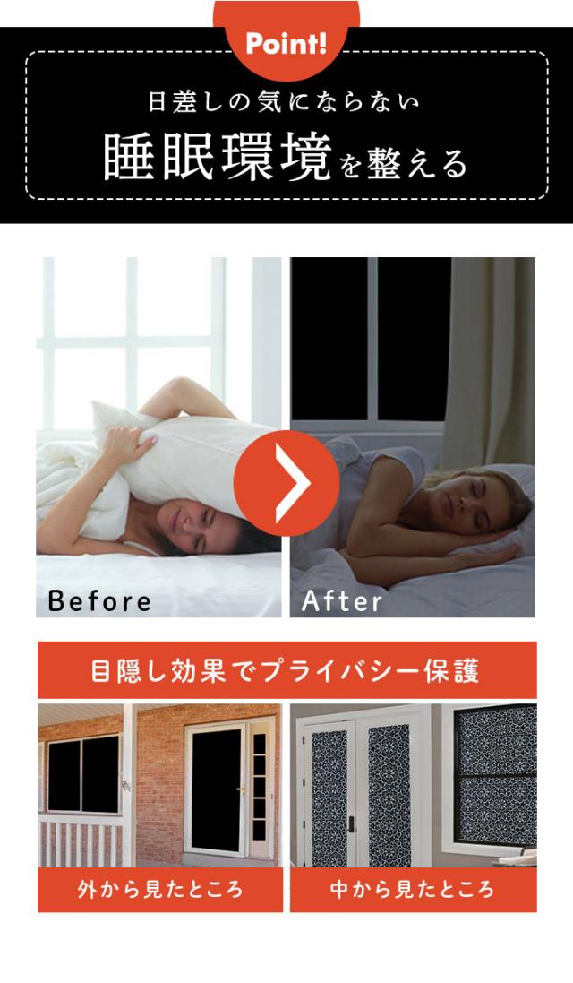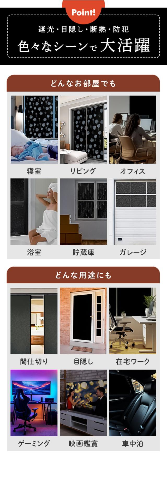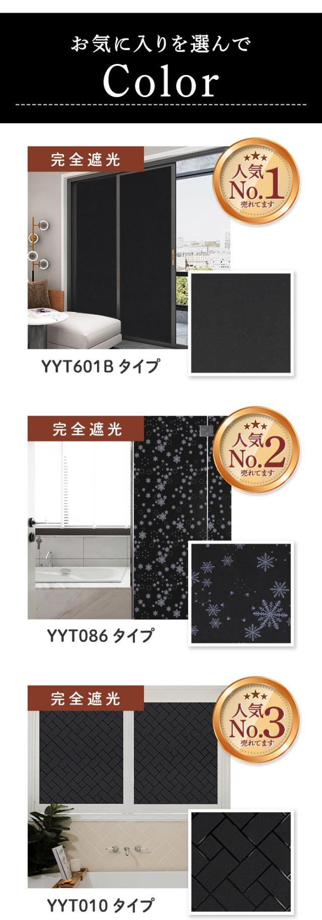 | 商品説明 | ・窓ガラスにピタッと貼り付けて、100%遮光!快適な睡眠とプライバシーを守りたい方に最適な「遮光シート」(60cmタイプ)が新登場。 ・昼間の太陽の光はもちろん、夜間の屋外からの光漏れからも、お部屋を24時間保護。夜勤でお仕事をされている方や、お昼寝する乳幼児の安眠確保に。 ・光と同時に紫外線もカットするため、日焼けが気になる方や、家具や内装の色褪せ予防にも効果的。 ・黒色不透明のシートが建物外部からの視線を遮断!おうち時間とプライバシーを大切にする方にもオススメ。 ・貼ってはがせる静電気吸着タイプのシートで、窓ガラスの表面にピタッ!特別なノウハウや工具なしに、どなたでも貼り付け可能!(※表面が平らな、透明平面ガラスにご使用ください。擦りガラス、型板ガラス、網入りガラスなどにはご使用になれません。) ・汚れや水滴がサッと拭き取れるPVC(ポリ塩化ビニル)素材だから、お手入れも簡単、手間いらず。 ・掃き出し窓や半間サイズの窓で貼りつけ作業がスムーズにできる、60cm×2mの大きめサイズ。 ・シンプルな「無地つや消し」(YYT601Bタイプ)、幻想的な「雪の結晶」(YYT086タイプ)、スタイリッシュな「斜めレンガ調」(YYT010タイプ)など、選べるパターンバリエーション。 (※カラーによりパターンバリエーションが異なります) |