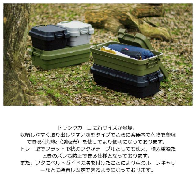 | 説明 | トランクカーゴに新サイズが登場。 収納しやすく取り出しやすい浅型タイプでさらに容器内で荷物を整理できる仕切板(別販売)を使ってより便利になっております。 トレー型でフラット形状のフタがテーブルとしても使え、積み重ねたときのズレも防止できる仕様となっております。 また、フタにベルトガイドの溝を付けたことにより車のルーフキャリーなどに装着し固定できるようになっております。 |