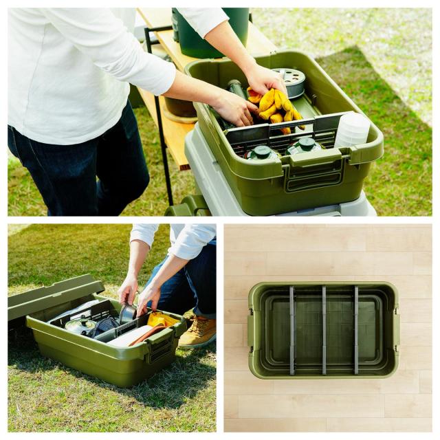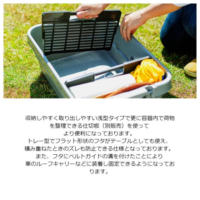 | 説明 | トランクカーゴに新サイズが登場。 収納しやすく取り出しやすい浅型タイプで更に容器内で荷物を整理できる仕切板(別販売)を使って より便利になっております。 トレー型でフラット形状のフタがテーブルとしても使え、 積み重ねたときのズレも防止できる仕様となっております。 また、フタにベルトガイドの溝を付けたことにより 車のルーフキャリーなどに装着し固定できるようになっております。 |