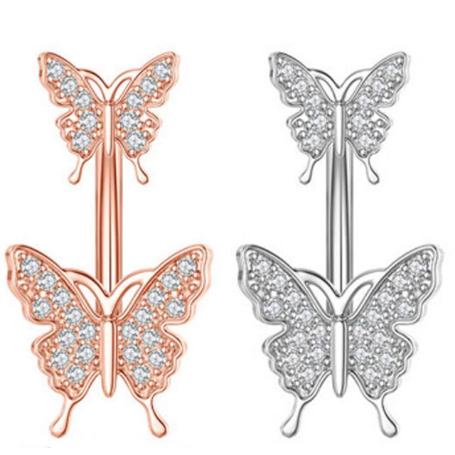 [14ゲージ ボディピアス] ダブルバタフライへそピアス 14G 三日月 銀色 シルバー ピンクゴールド ジルコニア クリスタル ストーン ジュエル 石付き ヘソピアス 臍ピアス サージカルステンレス 316Lボディーピアス メンズ レディース カーブバーベル 蝶 ちょう チョウ パベ