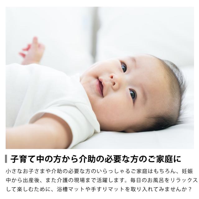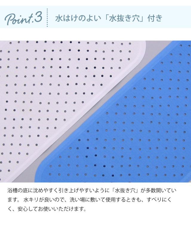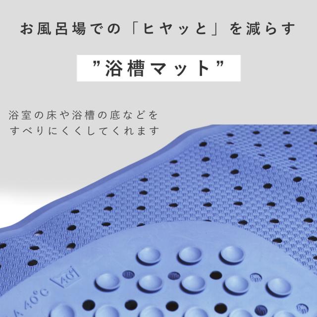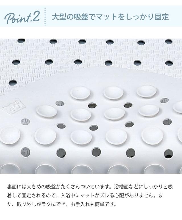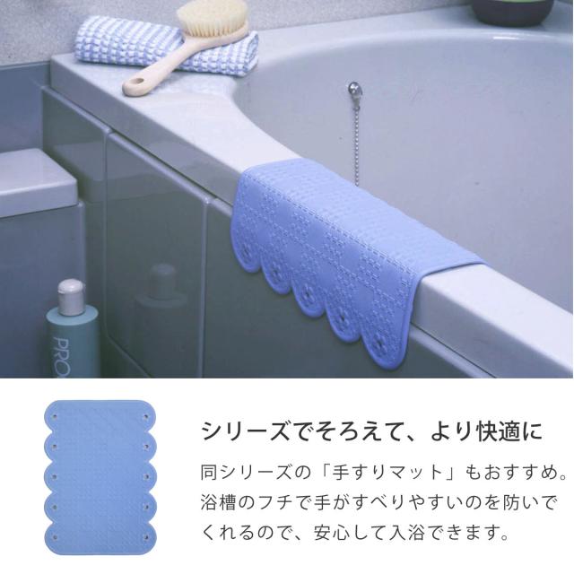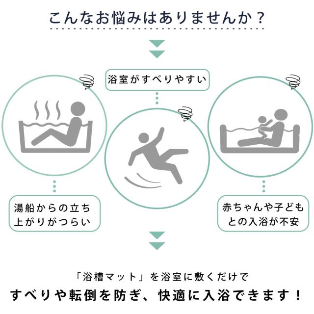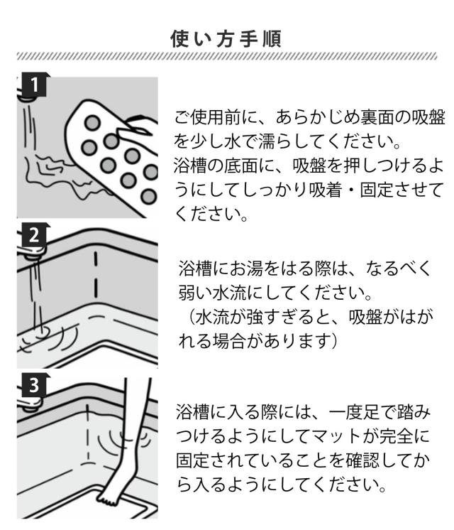 | 注意事項 | ※木製の浴そうや表面がザラザラしている面には吸盤が吸着しにくく、使用できない場合があります。 ※浴そうの底面に凹凸加工がある場合、凹凸部がマットの吸盤より大きく、表面が平滑な仕上がりであれば使用できますが、吸盤より小さな凹凸や表面がザラザラした素材であると吸盤が吸着しにくく、ご使用いただけない場合があります。 |