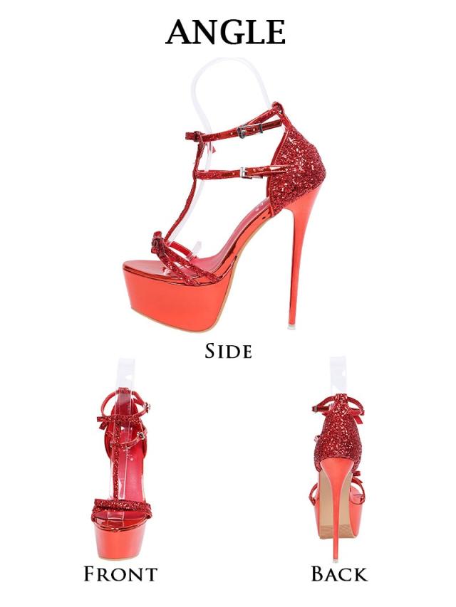 ☆レッドのグリッターラメが煌めくヒールサンダルは足元から輝くを放ってくれる派手可愛いキャバサンダルです♪
